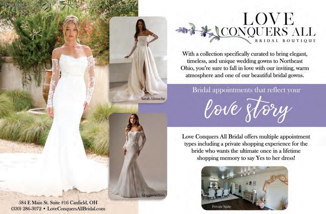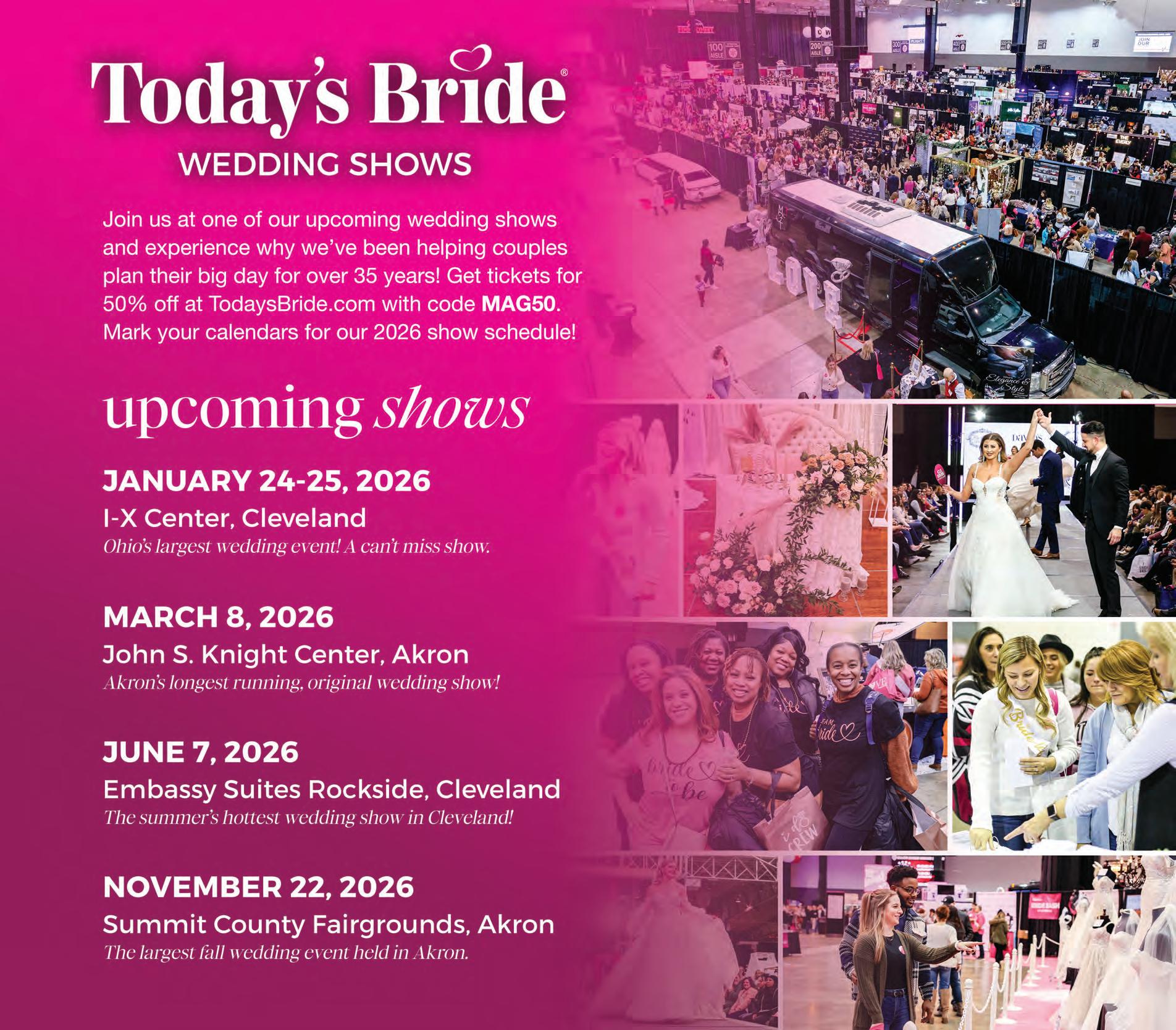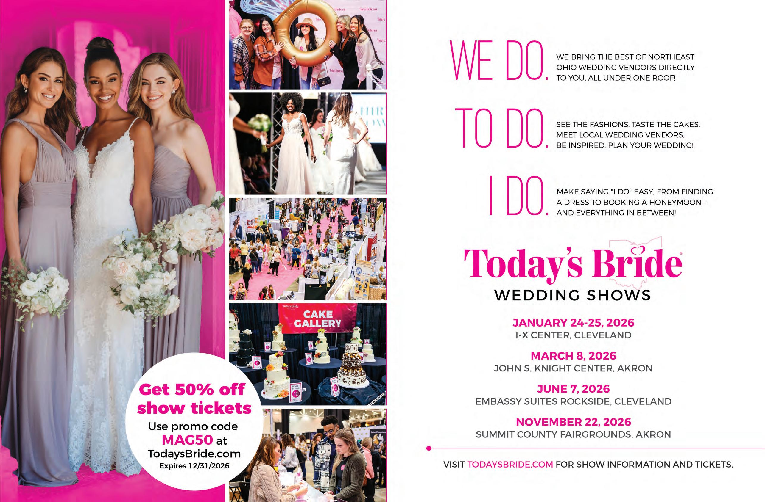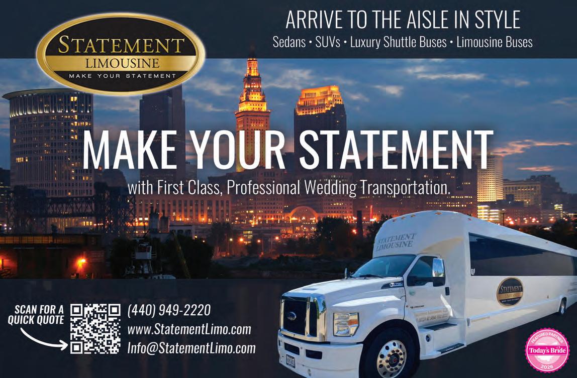 Today’s Bride Magazine is published annually in Northeast Ohio covering Summit, Stark, Portage, Wayne, Medina, Cuyahoga, Geauga, Lake, and Lorain counties. All articles and advertisements are property of Jadlyn Incorporated and may not be reproduced without the publisher’s written permission. Jadlyn Incorporated is not responsible or liable for any errors, misprints, misquotes or omissions. Copyright © 2025-2026. All rights reserved. Today’s Bride is not responsible for unsolicited editorial material unless a self-addressed, stamped return envelope is included. Advertisement in this publication does not imply the endorsement of Today’s Bride, Jadlyn Incorporated, or any of its representatives. For further information call our offices at 330-670-9545 or 216-393-5677. Printed in the USA.