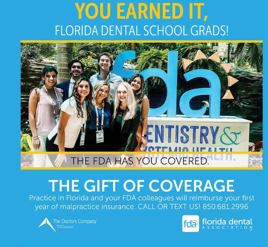 WHEN YOU SUPPORT OUR ADVERTISERS, PLEASE MENTION TODAY’S FDA! Advertising Information For display advertising information, contact: Deirdre Rhodes at drhodes@floridadental.org or 800.877.9922, Ext. 7108. For Career Center advertising information, contact: Jill Runyan at jrunyan@floridadental.org or 800.877.9922, Ext. 7113. Publishing Information Today’s FDA (ISSN 1048-5317/USPS 004-666) is published bimonthly by the Florida Dental Association (FDA), 545 John Knox Road, Ste. 200, Tallahassee, FL 32303. FDA membership dues include a complimentary subscription to Today’s FDA. Nonmember subscriptions are $150 per year; foreign, $188. Periodical postage paid at Tallahassee, FL and additional entry offices. Copyright 2024 Florida Dental Association. All rights reserved. Today’s FDA is a refereed publication. POSTMASTER: Please send form 3579 for returns and changes of address to Today’s FDA, 545 John Knox Road, Ste. 200, Tallahassee, FL 32303. Editorial and Advertising Policies Editorial and advertising copy are carefully reviewed, but publication in this journal does not necessarily imply that the FDA endorses any products or services that are advertised, unless the advertisement specifically says so. Similarly, views and conclusions expressed in editorials, commentaries and/or news columns or articles that are published in the journal are those of the authors and not necessarily those of the editors, staff, officials, Board of Trustees or members of the FDA. Editorial Contact Information All Today’s FDA editorial correspondence should be sent to Dr. Hugh Wunderlich, Today’s FDA Editor, Florida Dental Association, 545 John Knox Road, Ste. 200, Tallahassee, FL 32303. FDA office numbers: 800.877.9922, 850.681.3629; fax: 850.561.0504; email address: fda@floridadental.org; website address: floridadental.org Today’s FDA is a member publication of the American Association of Dental Editors and the Florida Magazine Association. 3% Dental Practice Brokerage, LLC ..................................... 84 ADA Credit Card ..................................................... 29 American Sensor Tech ................................................ 84 Choice Dental Practice Transitions ..................................... 75 DigiTech 80 Doctor’s Choice 71 E-VAC INC. 45 FDA: Award Winners 62 FDA: Career Center ................................................... 16 FDA: Online Radiography Program ..................................... 81 FDA: Peer Review Program ............................................. 6 FDA Foundation: Emerald Club ........................... Inside Back Cover FDA: Well-being Program ............................................. 29 FDAS: Abyde 30 FDAS: Bank of America 38 FDAS: Contributed $16 Million 32 & 33 FDAS: Flood 70 FDAS: FDAS Agents ..................................... Inside Front Cover FDAS: Gift of Coverage ......................................... Back Cover FDC2024 Exhibit Hall ............................................. 58 & 59 Glidewell ........................................................... 50 Henry Schein Professional Practice Transitions 86 My Dental TEK 74 The Doctors Company 13 Tobacco Free Florida 29 Wounded Veterans Relief Fund ........................................ 61