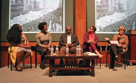(Top) Rachel at the Frazier History Museum’s Bourbon Bottle Hall. In addition to moderating Bridging the Divide discussions (left), Rachel helps oversee the museum’s curatorial and exhibits, education, programming, and fundraising.