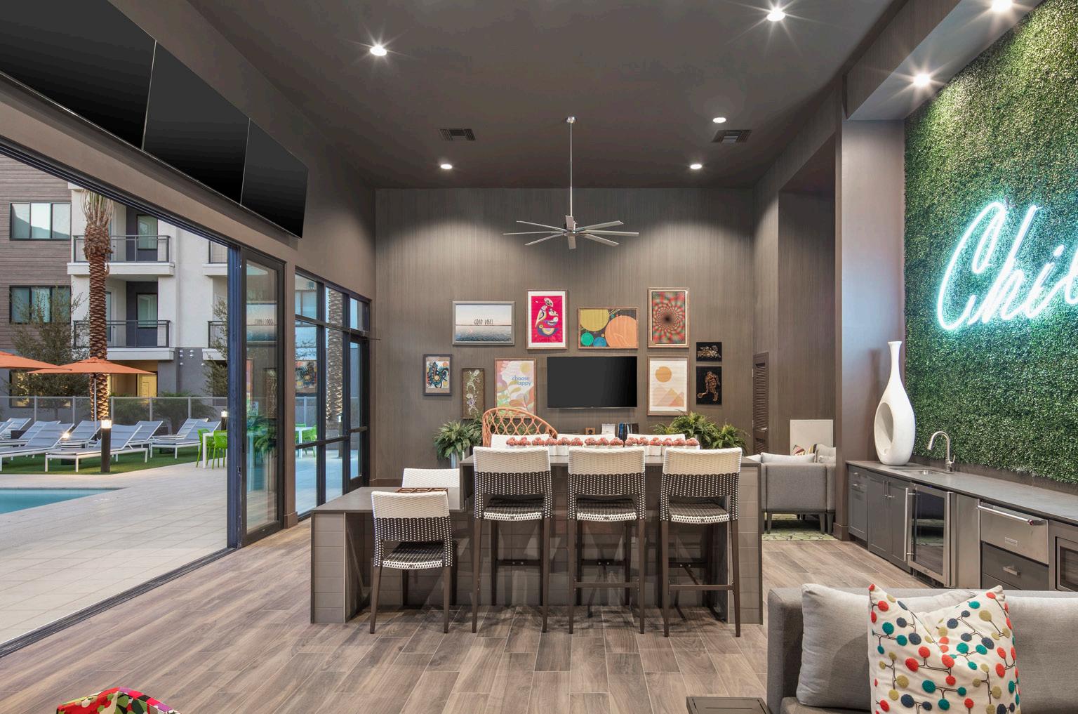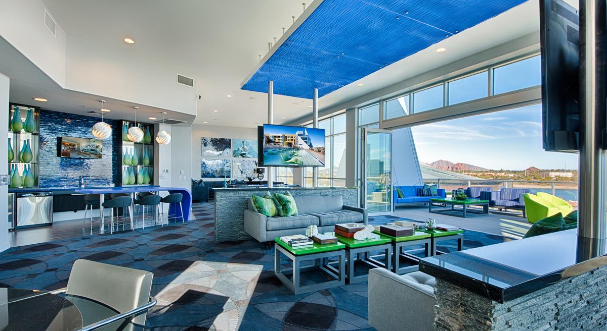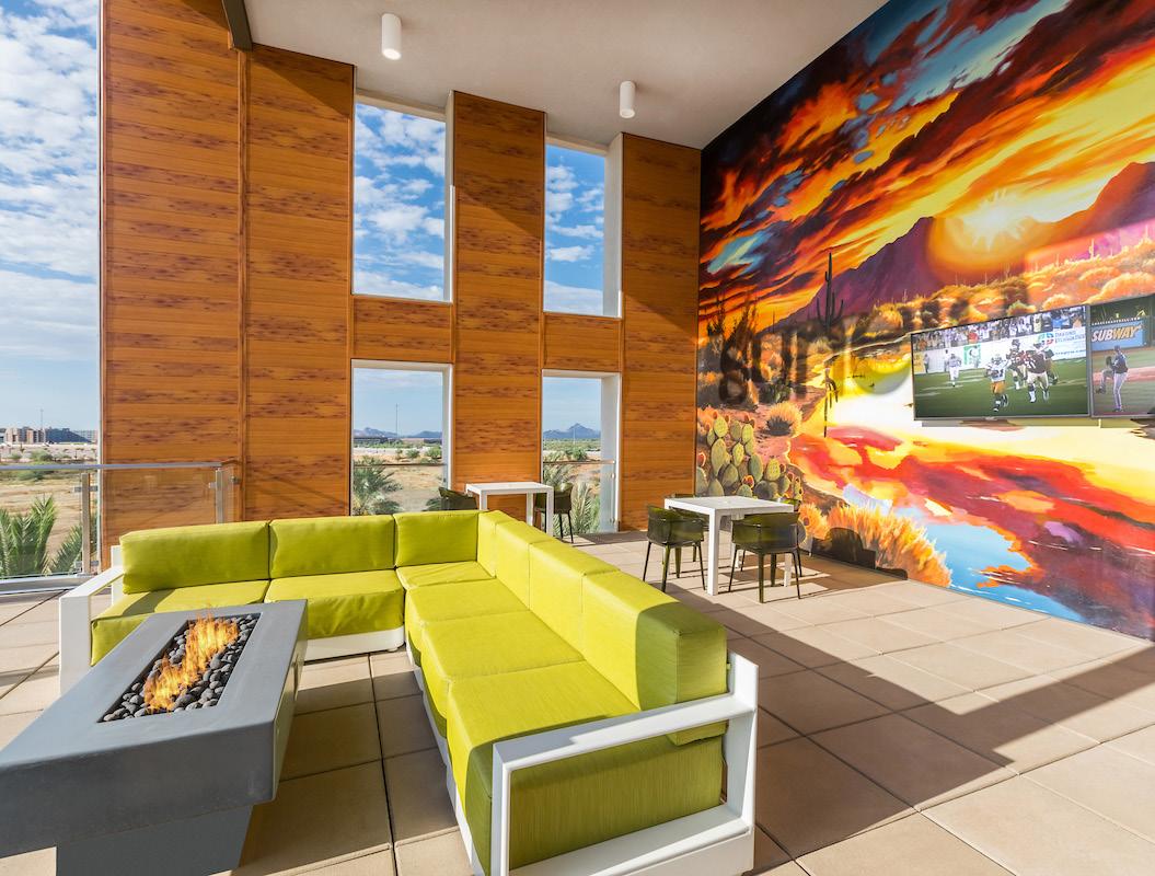 Camden North End is a 441-unit luxury multi-family apartment community located nearby Desert Ridge Marketplace with shops, dining, and entertainment. The nearby Mayo Clinic Hospital influenced the design of the community. The design concept focused on health, wellness, and the importance of nature. Many of the interior finishes are natural color tones, wood, or wood-looking material. The design was intended to carry a resident through the building so that it mimicked the healing process; the first-floor palette is more calm and restorative, whereas the secondfloor palette is a little brighter, bolder, and more cheerful. The units are within 3-and 4-story buildings with tuck-under garages. The 2-story clubhouse provides residents with several high-class amenities to workout, relax, and entertain. This includes a fitness center, yoga/spin studio, wifi lounges, and a coffee bar. There also is an indoor/outdoor lounge with billiards, a bar, and an entertainment kitchen. Outdoor amenities include several tranquil spaces, a rooftop deck with a fire table and lounging area, a resort-style pool and spa, an indoor/outdoor Zen garden with 2 dog parks, and a grooming area.
