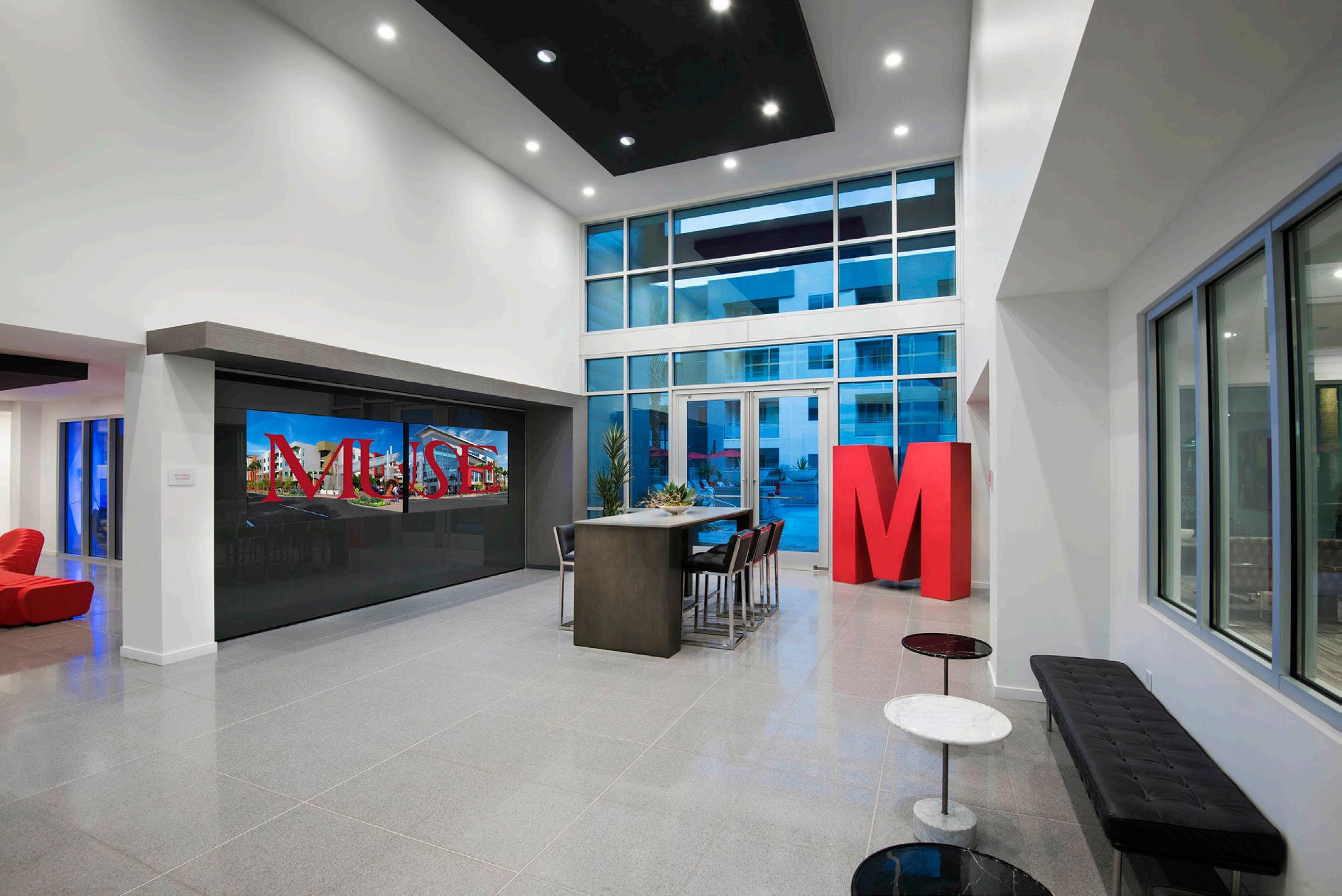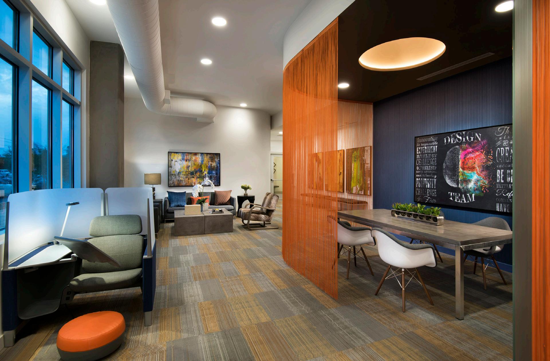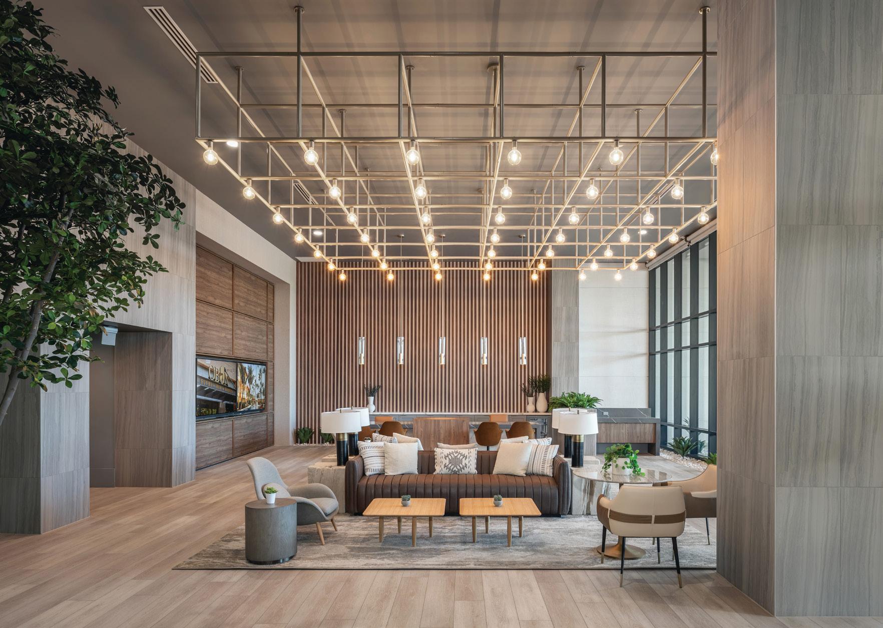 Camden North End is a 441-unit luxury multi-family apartment community located nearby Desert Ridge Marketplace with shops, dining, and entertainment. The nearby Mayo Clinic Hospital influenced the design of the community. The design concept focused on health, wellness, and the importance of nature. Many of the interior finishes are natural color tones, wood, or wood-looking material. The design was intended to carry a resident through the building so that it mimicked the healing process; the first-floor palette is more calm and restorative, whereas the secondfloor palette is a little brighter, bolder, and more cheerful. The units are within 3-and 4-story buildings with tuck-under garages. The 2-story clubhouse provides residents with several high-class amenities to workout, relax, and entertain. This includes a fitness center, yoga/spin studio, wifi lounges, and a coffee bar. There also is an indoor/outdoor lounge with billiards, a bar, and an entertainment kitchen. Outdoor amenities include several tranquil spaces, a rooftop deck with a fire table and lounging area, a resort-style pool and spa, an indoor/outdoor Zen garden with 2 dog parks, and a grooming area.