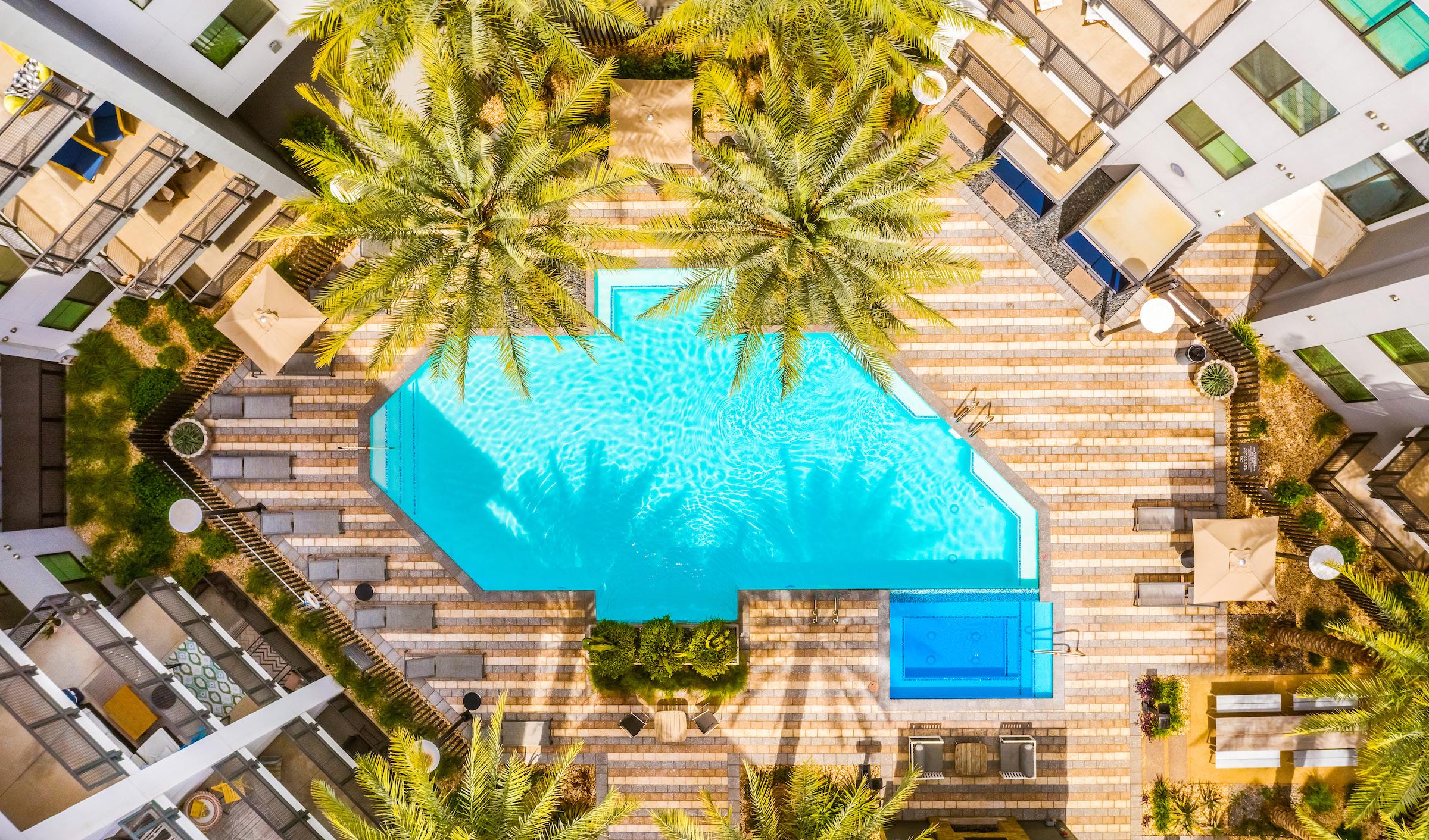 The entry to the community was thoughtfully designed, with its grand two-story porte-cochere featuring striking columns, beautiful stone paving, an alluring turquoise water feature, and palm trees lining the entry. The resort-like style continues with the designed amenities. The Retreat Spa is a unique and sophisticated upgrade to these apartments, offering full spa services.