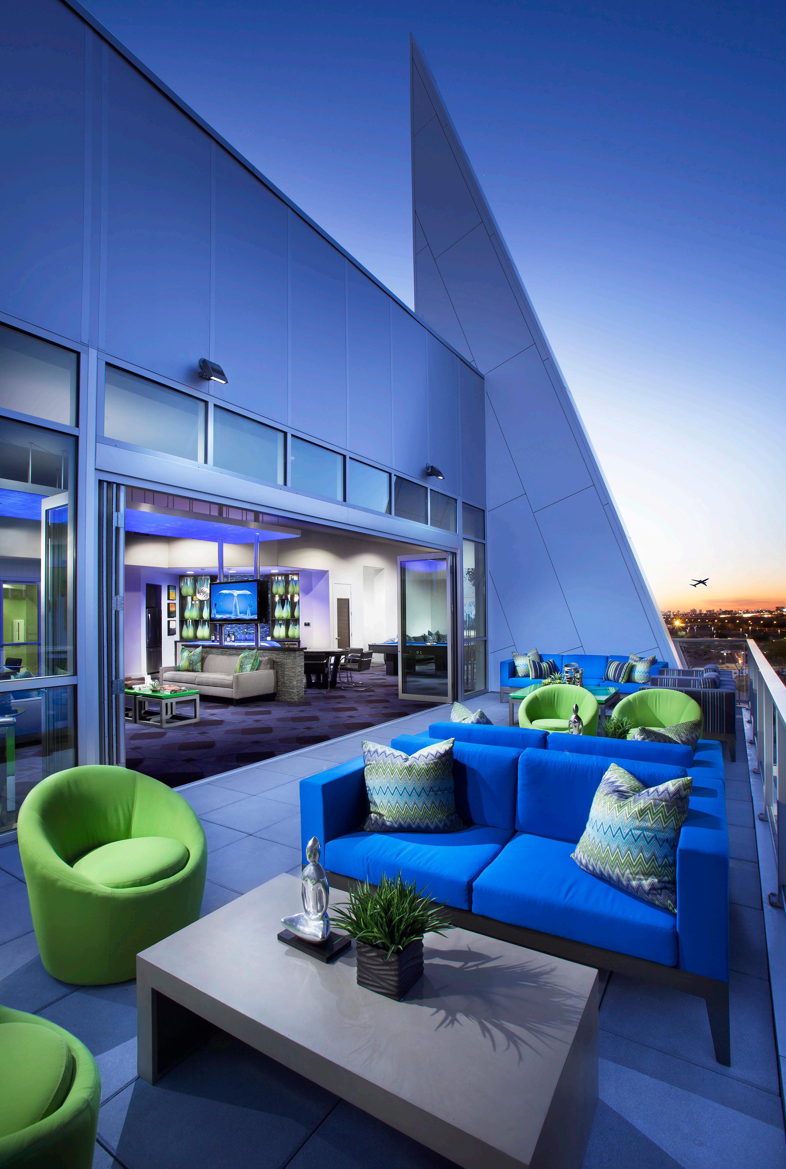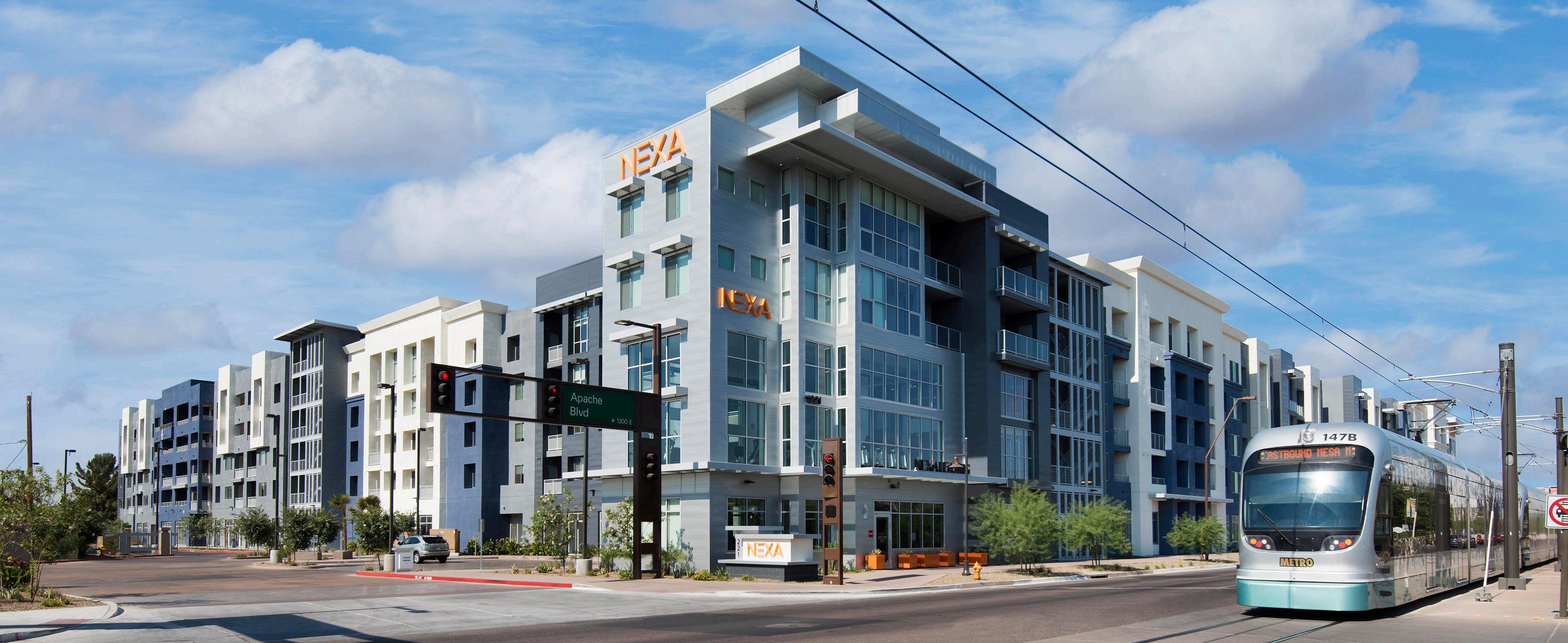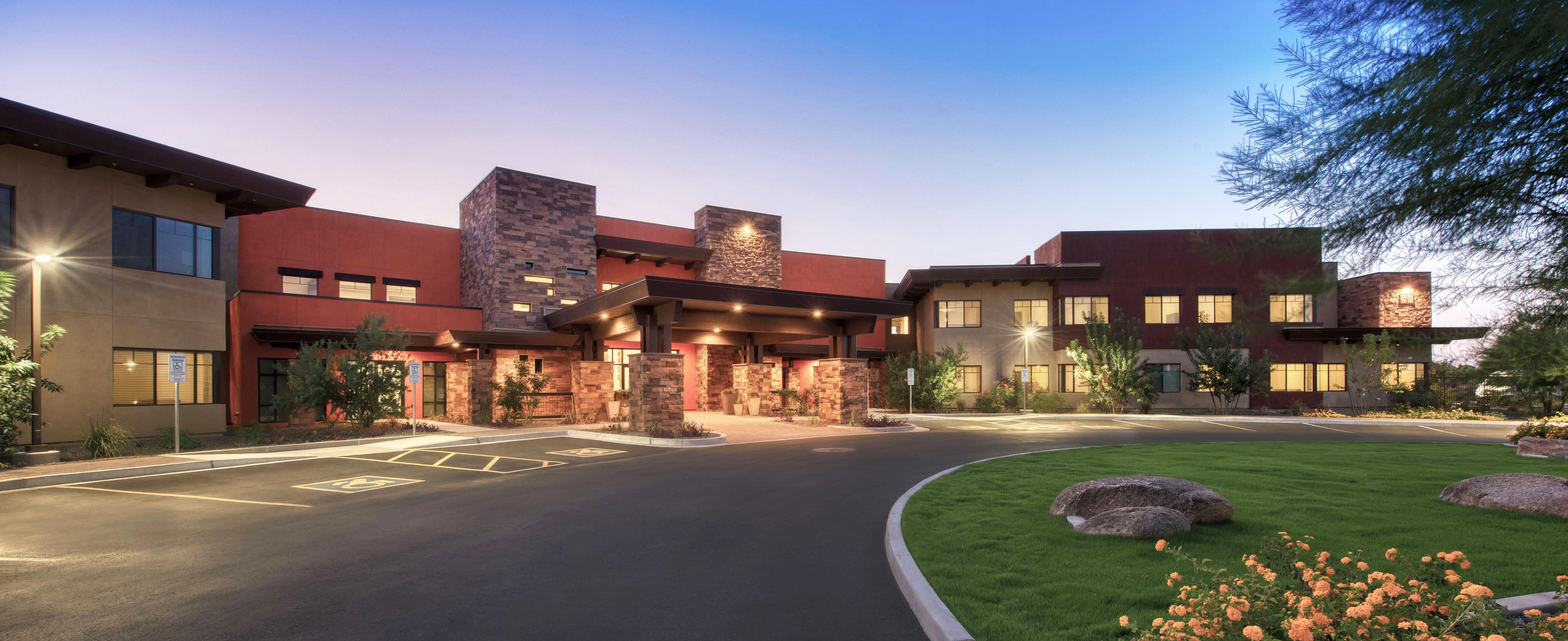 The property features the use of innovative materials such as a cast earth fireplace in the lounge, dark gray integral colored concrete block as an exterior design feature, and the use of an exterior wood-tone like product designed to hold up in the heat of the summers of Arizona to compliment the design of Phase I. Common amenities include business and fitness centers, on-site laundry, package service, controlled access, residence lounge, swimming pool, and spa.