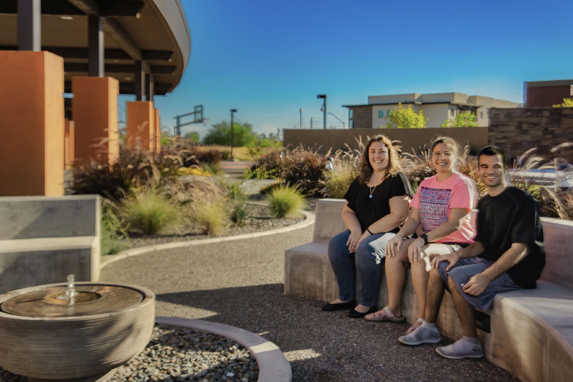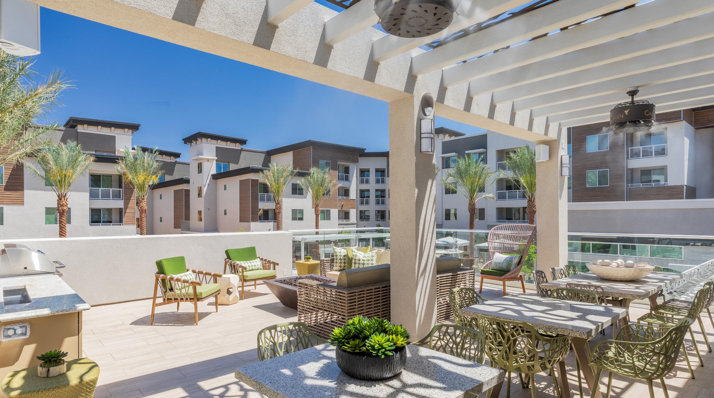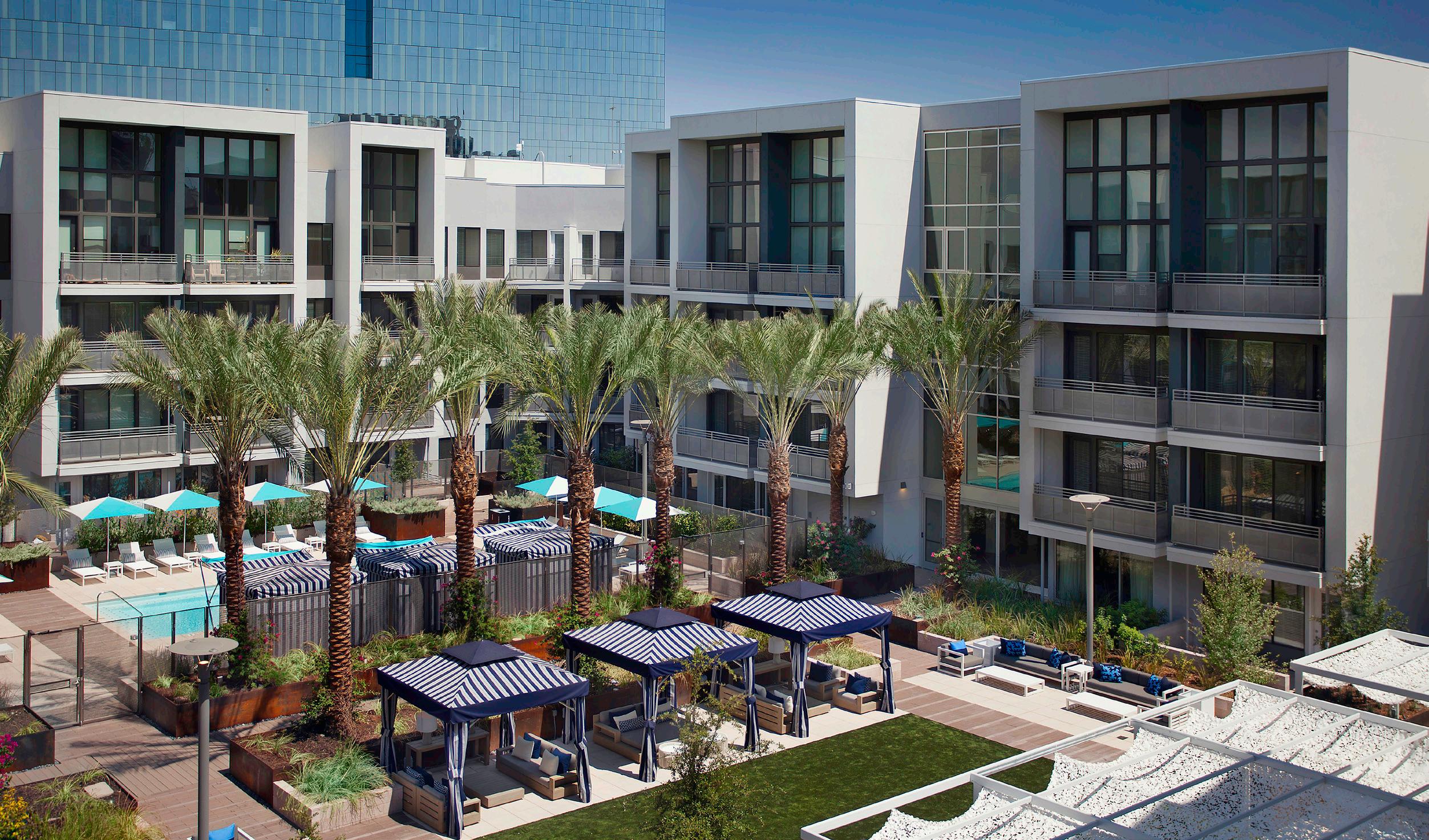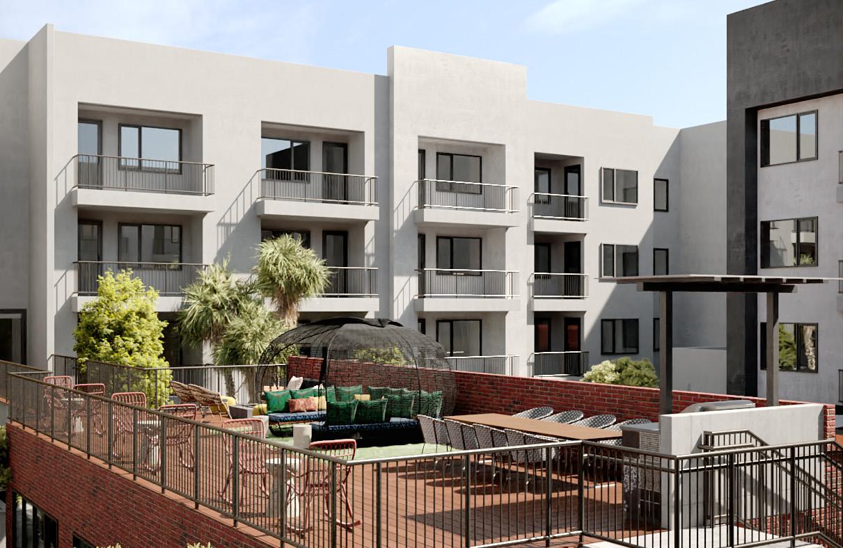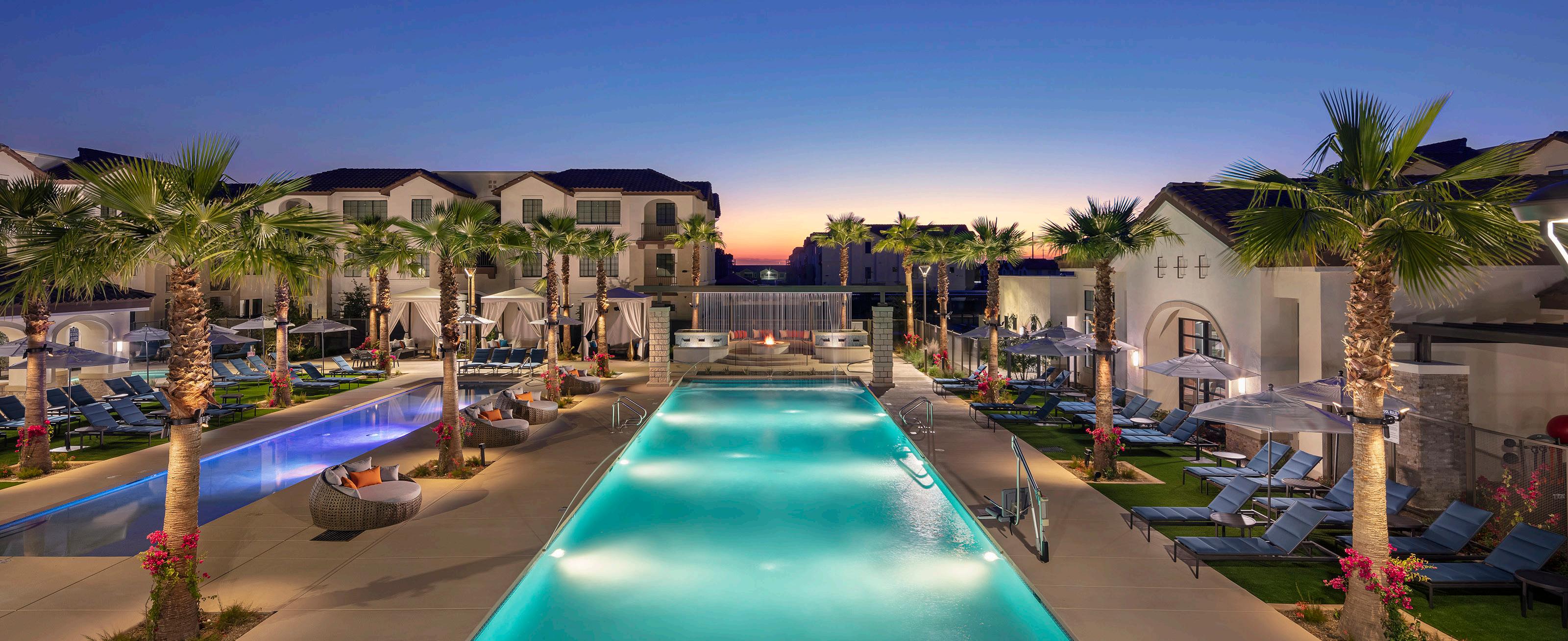 Positioned along SanTan Village Parkway, the street frontage offers a strong, inviting design through colors and textures. A canopy of trees provides a shaded walkway for residents. The main amenity space is centered around the pool court deck. Designed for entertainment and relaxation, this area features a large pool and spa, private cabanas, turf lounge space, and an entertainment Ramada featuring a TV, BBQ station, and seating areas. The community also has a dog park, bike repair and storage, and 2 additional BBQ Ramada areas.