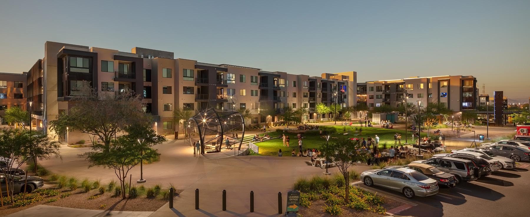 This pedestrian-oriented community was designed to create a walkable urban feel. A pop-up shop and restaurant are located on the ground level along McDowell Road, providing pedestrian-friendly street frontage.
