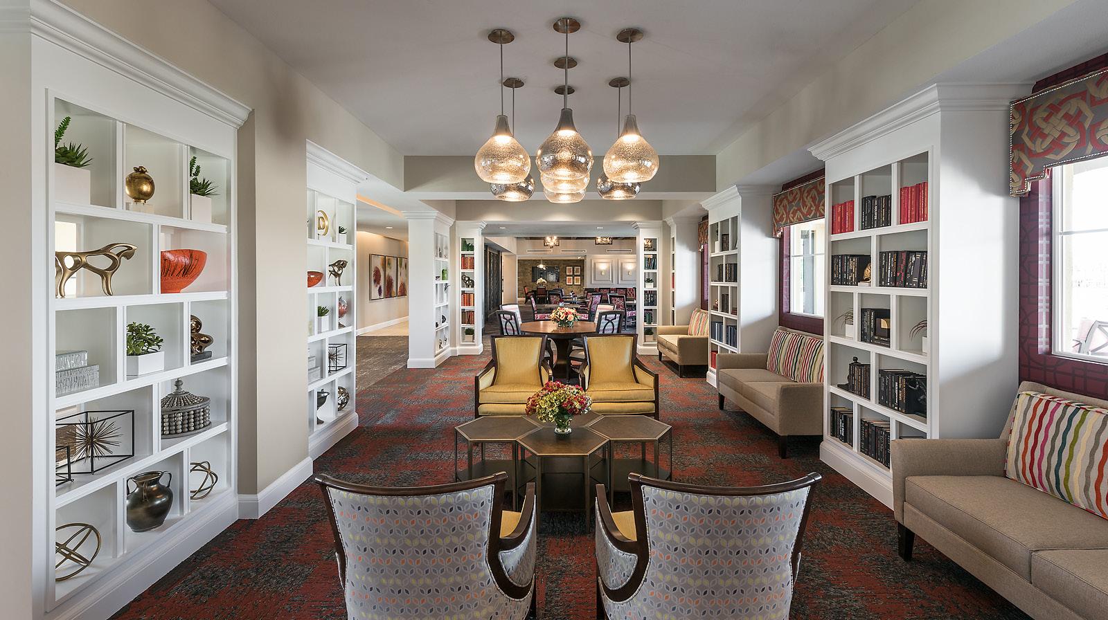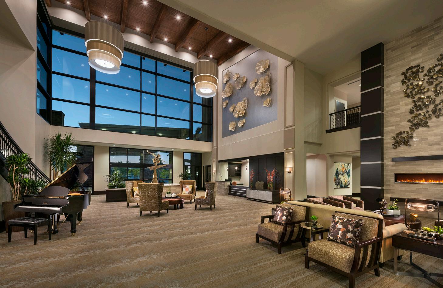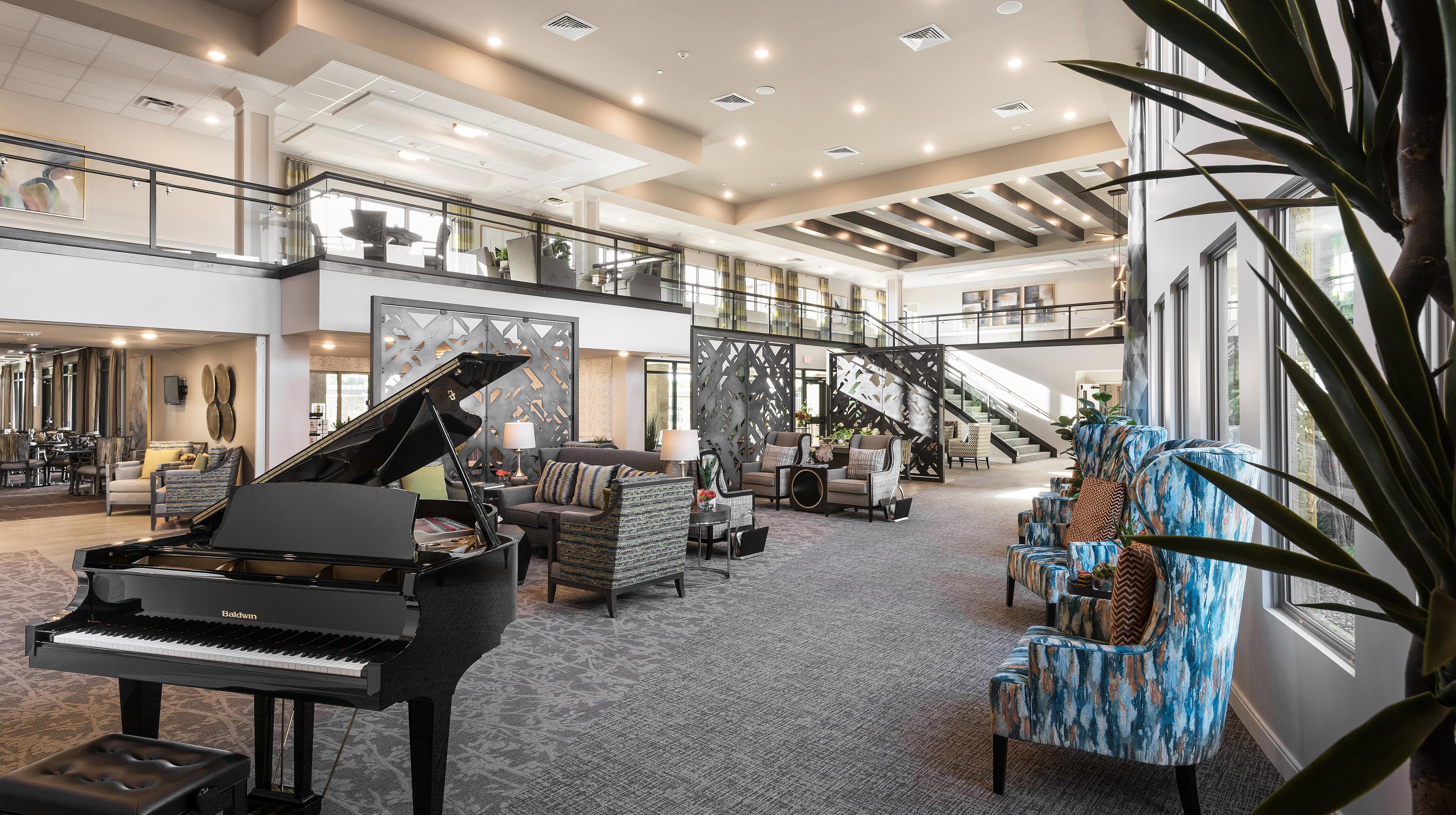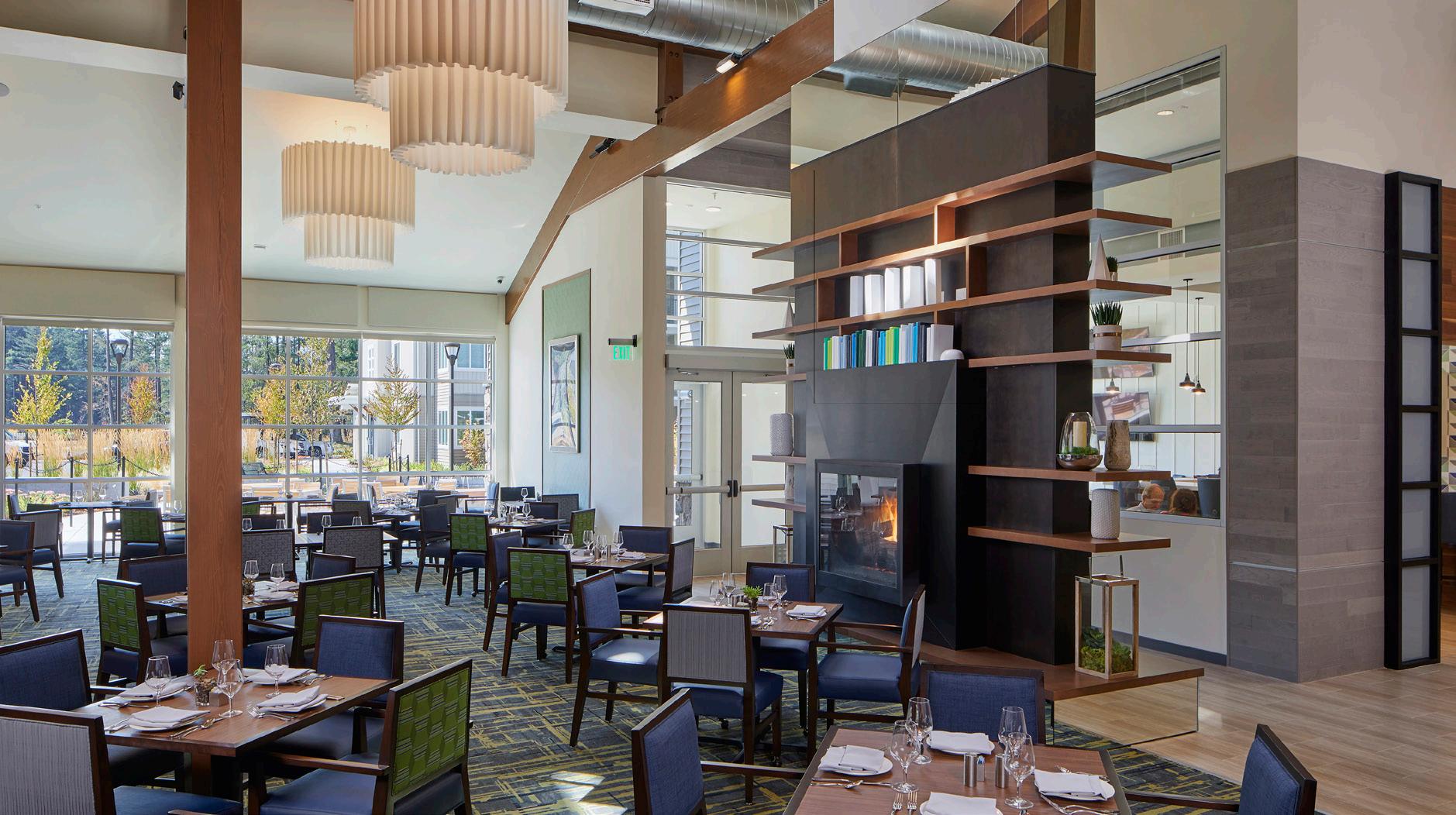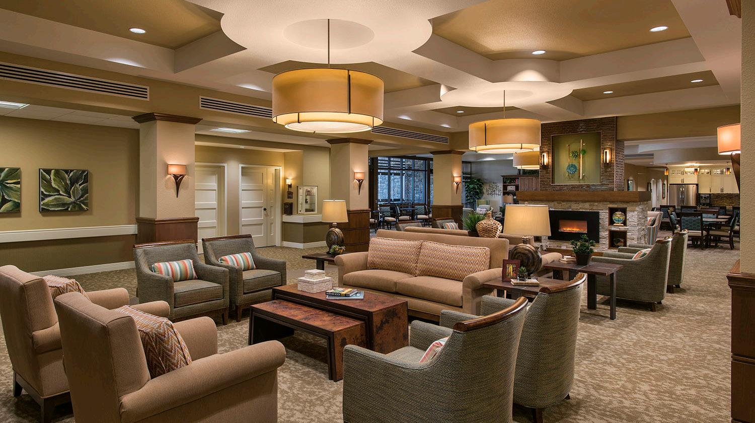 A 2-story, high volume formal dining room is open to the 2nd floor provides comfort and luxury while residents dine. A therapy garden located on the south side of the building uses mixed paving surfaces and seating nodes to appeal to different senses. It also features a putting green. Next to the therapy garden is a courtyard with a calming water feature and a fire pit that is a focal point surrounded by a lounge seating area where residents can relax and unwind.