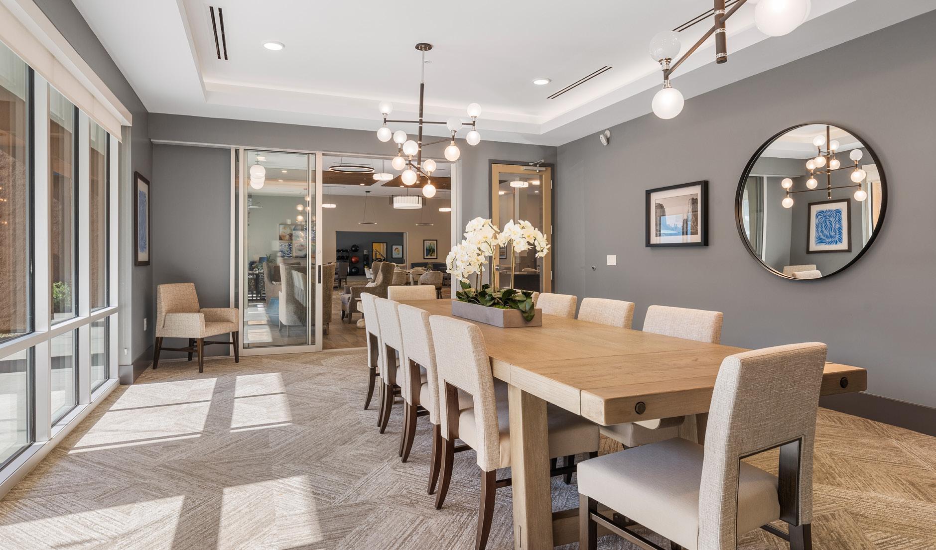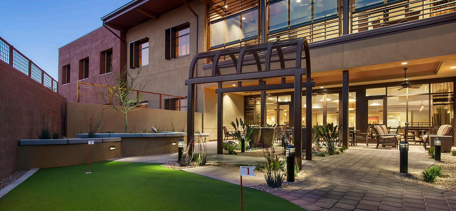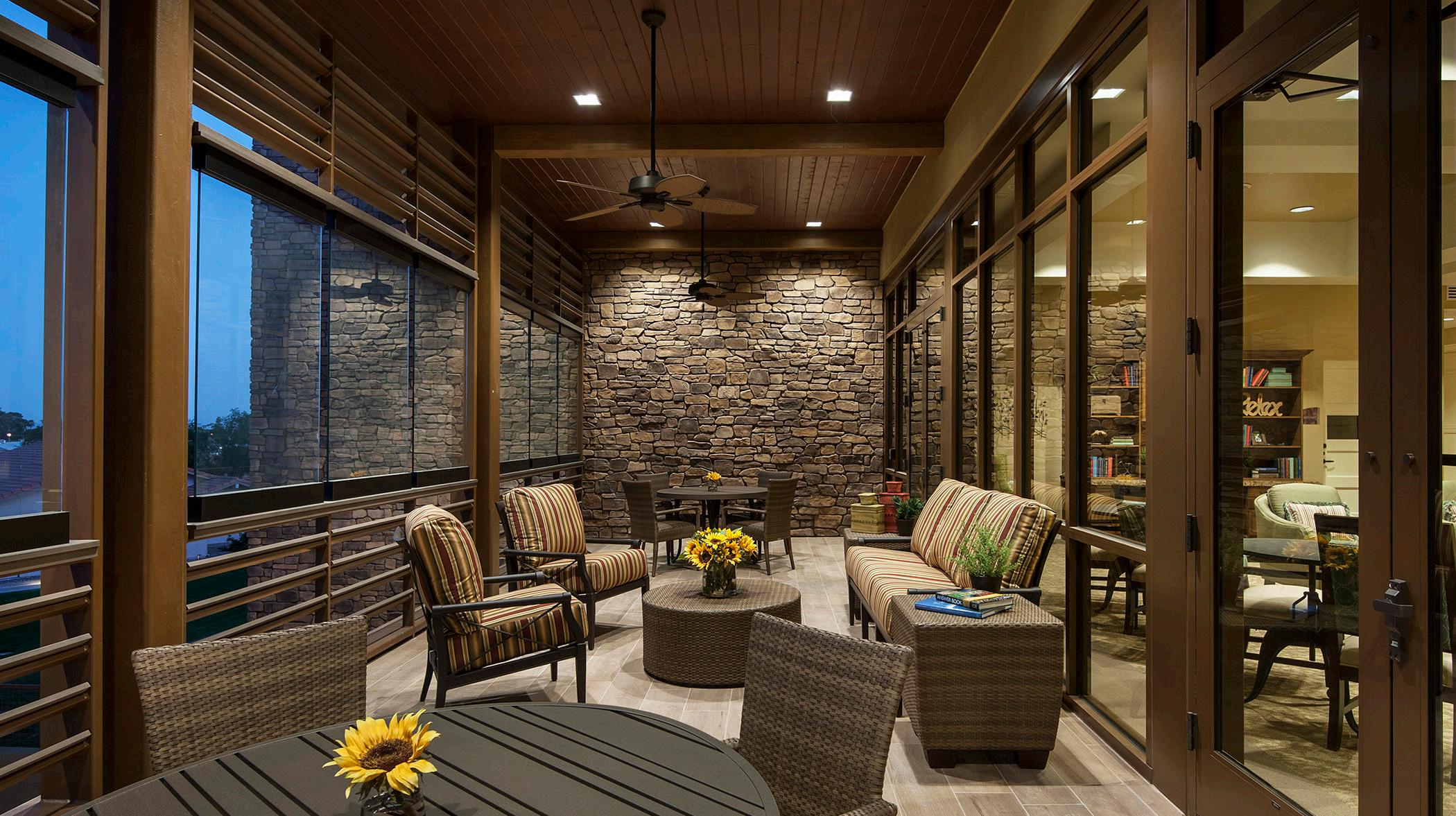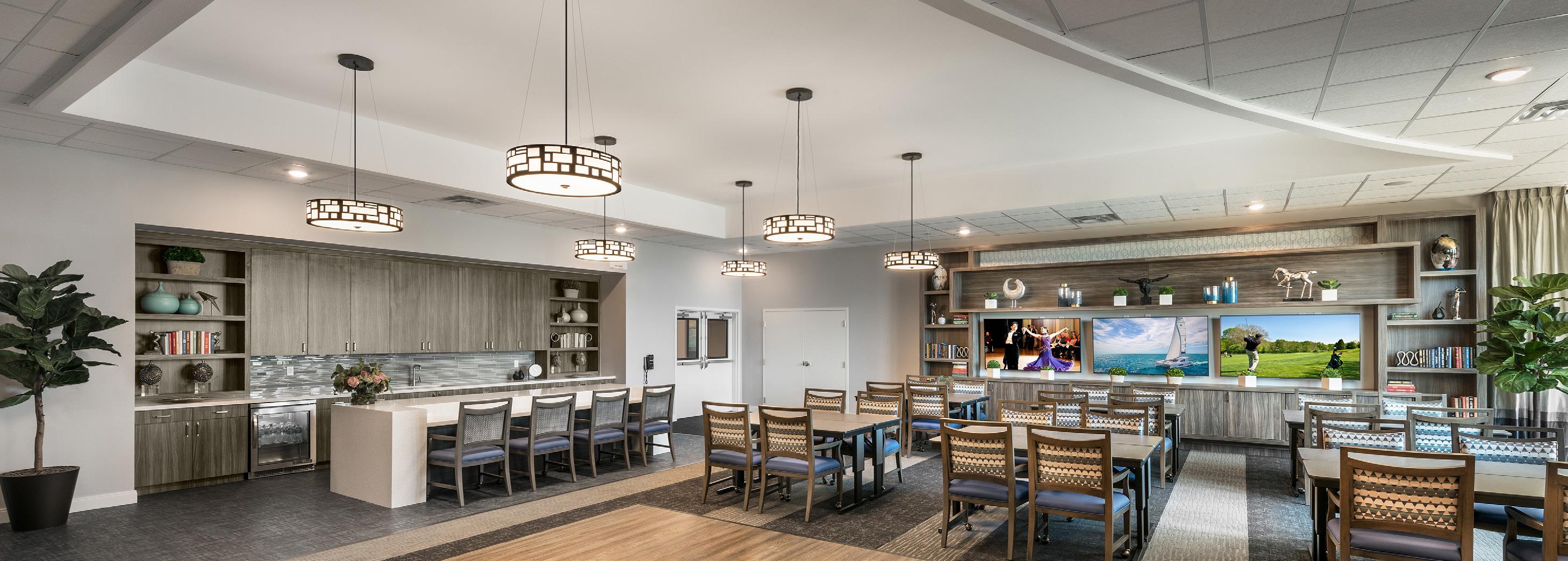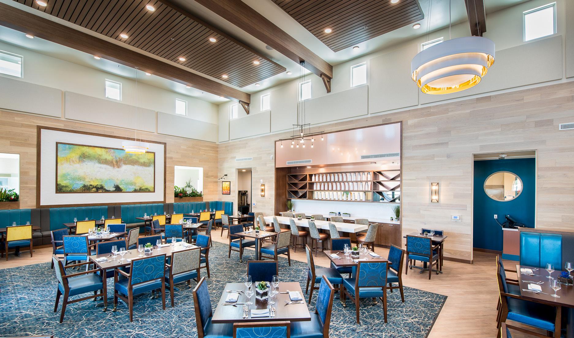 A 2-story, high volume formal dining room is open to the 2nd floor provides comfort and luxury while residents dine. A therapy garden located on the south side of the building uses mixed paving surfaces and seating nodes to appeal to different senses. It also features a putting green. Next to the therapy garden is a courtyard with a calming water feature and a fire pit that is a focal point surrounded by a lounge seating area where residents can relax and unwind.
