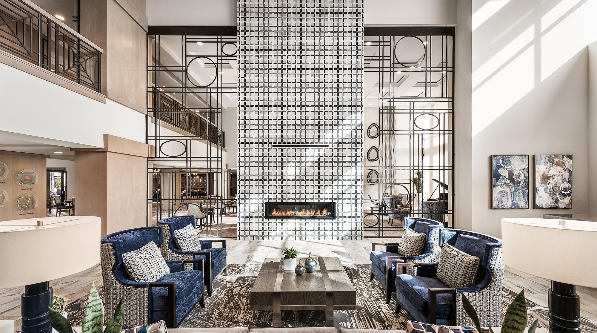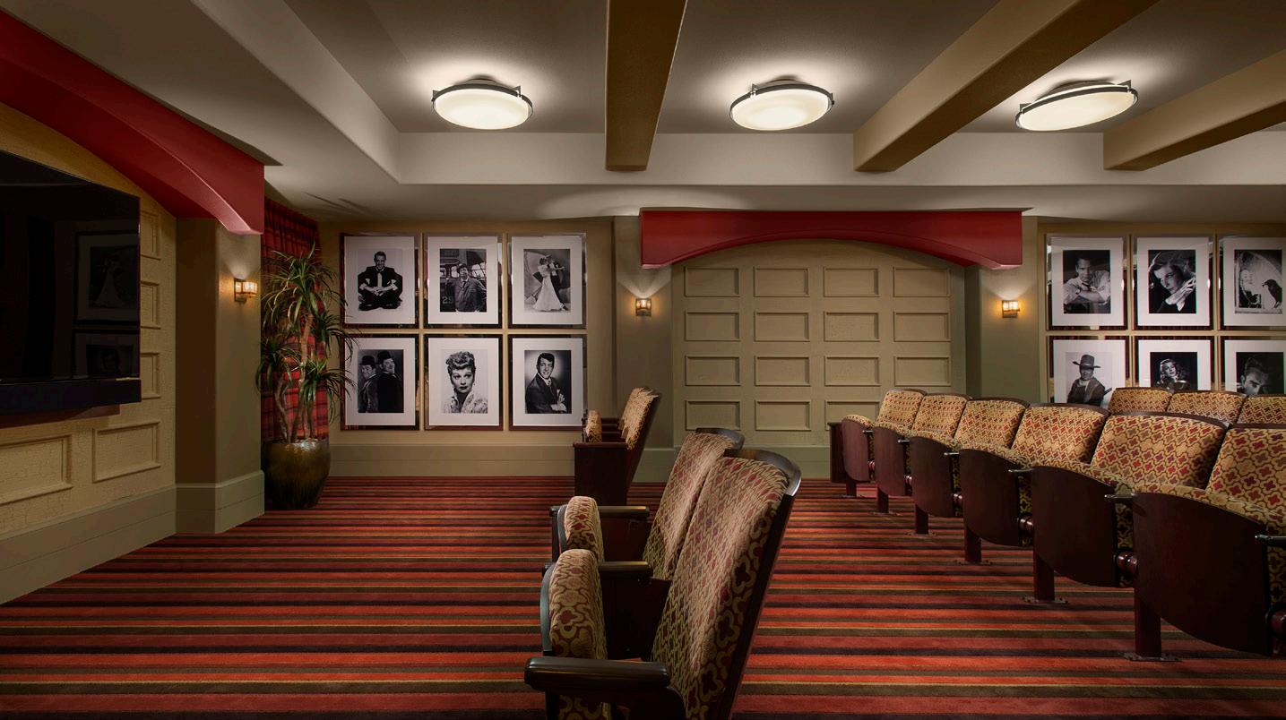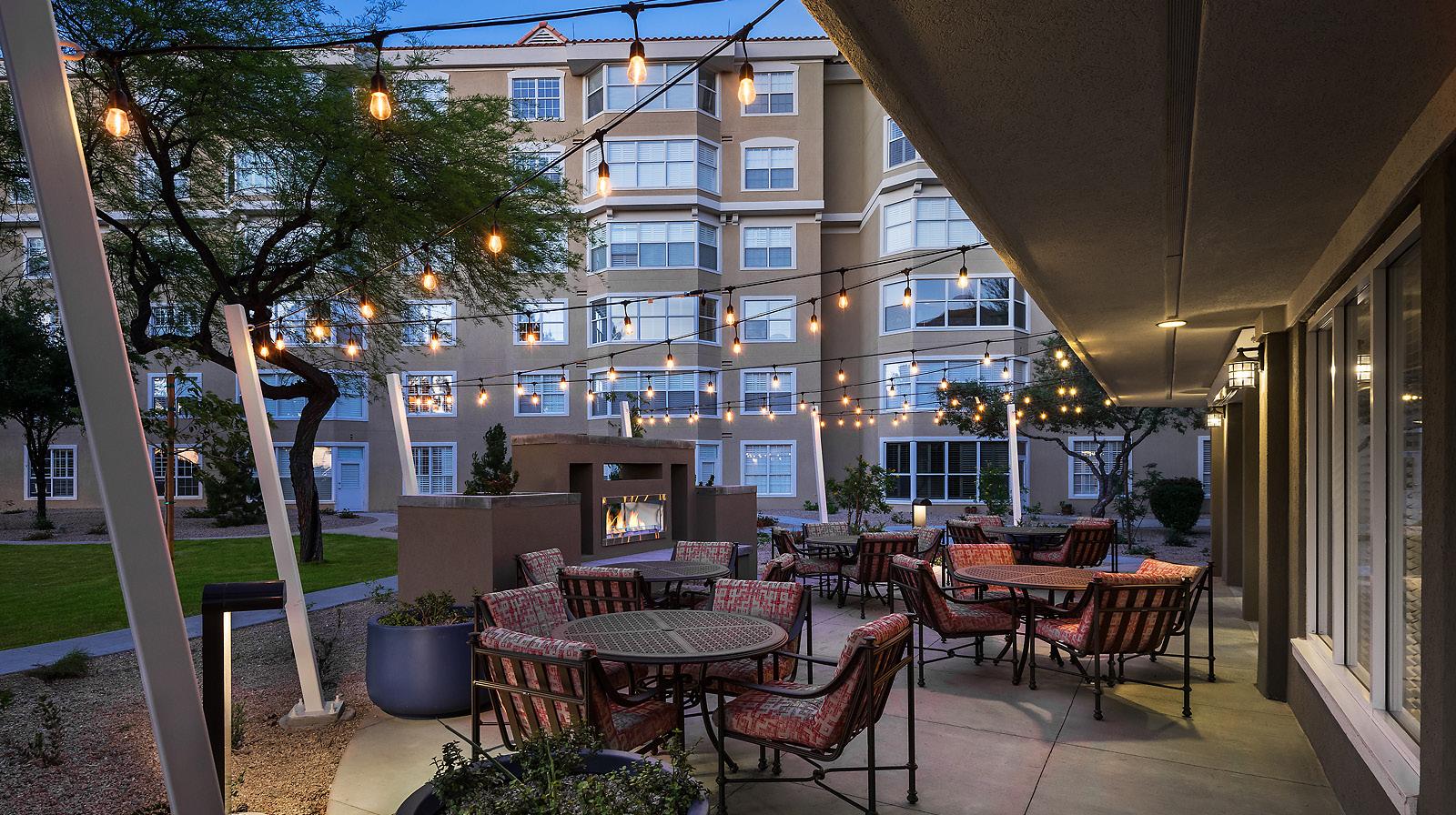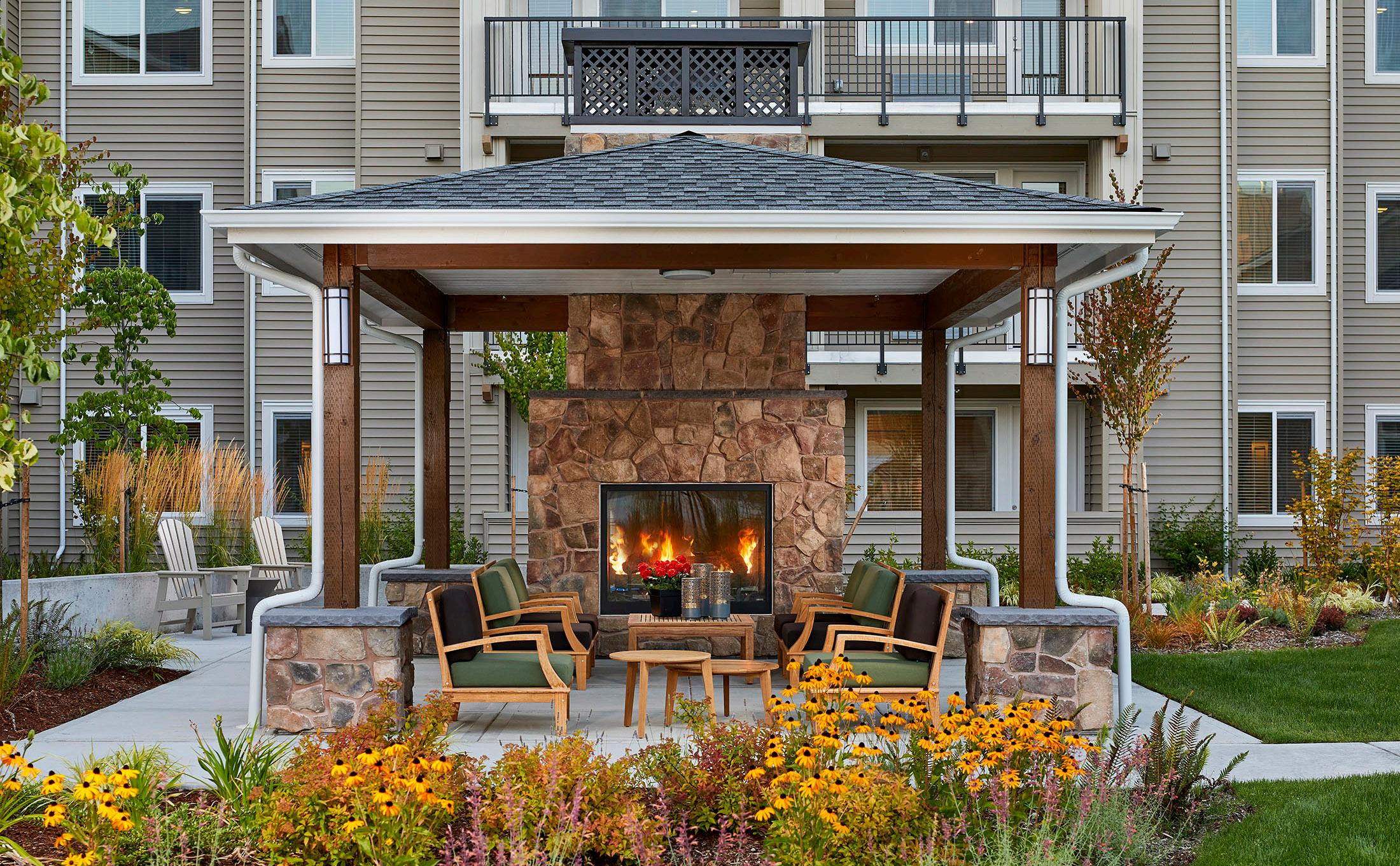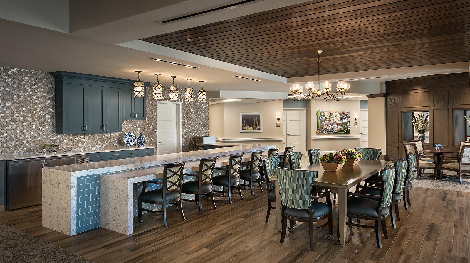 A 2-story, high volume formal dining room is open to the 2nd floor provides comfort and luxury while residents dine. A therapy garden located on the south side of the building uses mixed paving surfaces and seating nodes to appeal to different senses. It also features a putting green. Next to the therapy garden is a courtyard with a calming water feature and a fire pit that is a focal point surrounded by a lounge seating area where residents can relax and unwind.