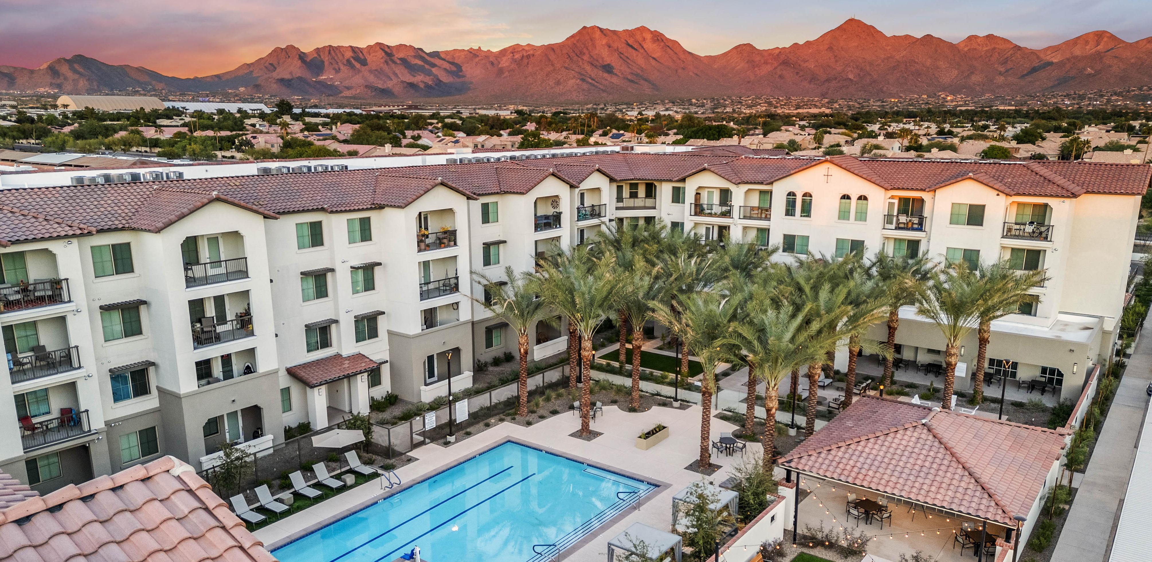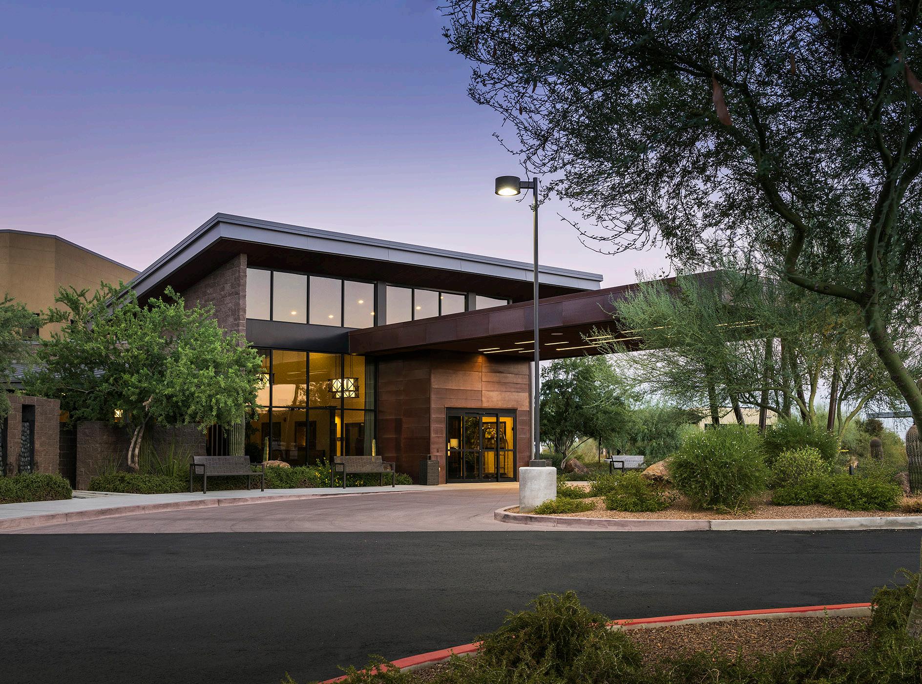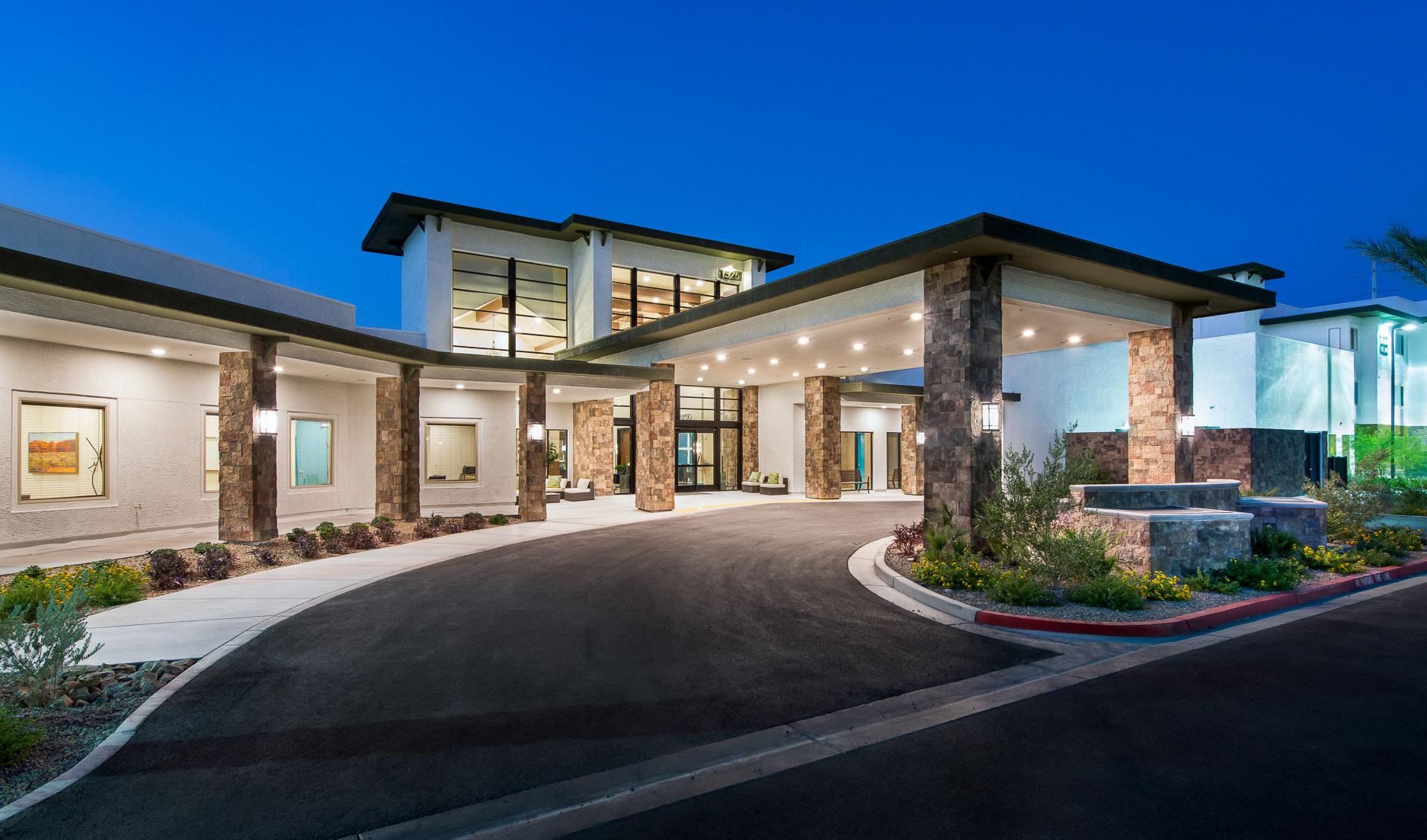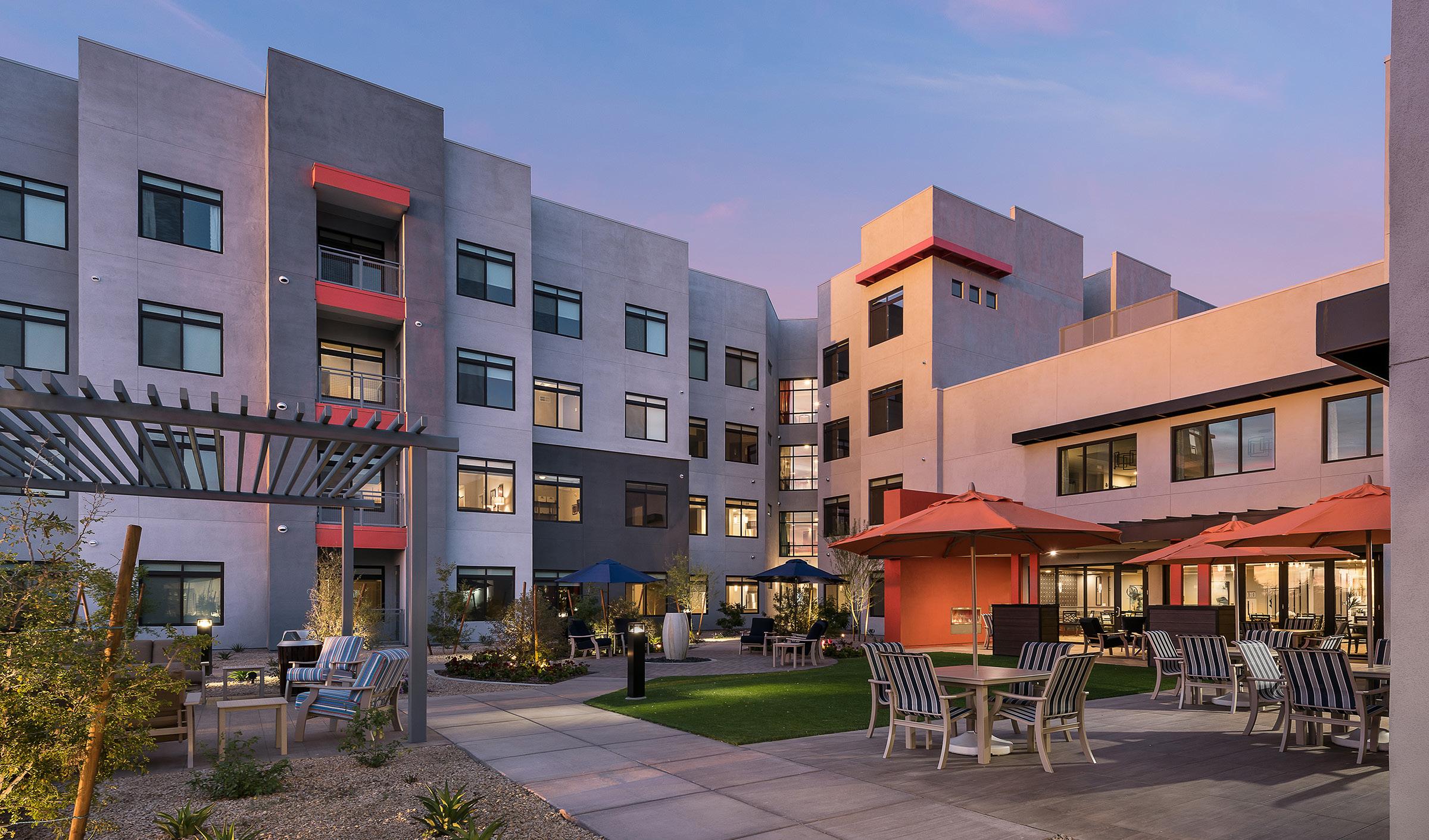 As an award-winning development, Clearwater Pinnacle Peak is a 110-unit resort-style senior living community tailored after its sister properties, Clearwater Agritopia and Clearwater Ahwatukee to reflect an active, upscale lifestyle. This community features 90 independent living/ assisted living units and 20 memory support units. Located in prime North Scottsdale, just north of the 101 freeway, Clearwater Pinnacle Peak replaced an iconic abandoned office building in an active development area. Adjacent to an established residential neighborhood, the site plan, program, and architecture integrated this community and its residents into an existing walkable environment, directly connecting them to a 2-level shared parking structure, restaurants, grocery store, and other retail shops.