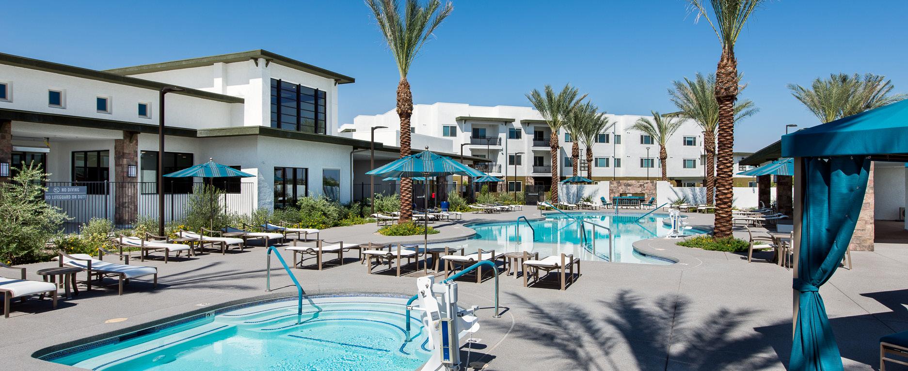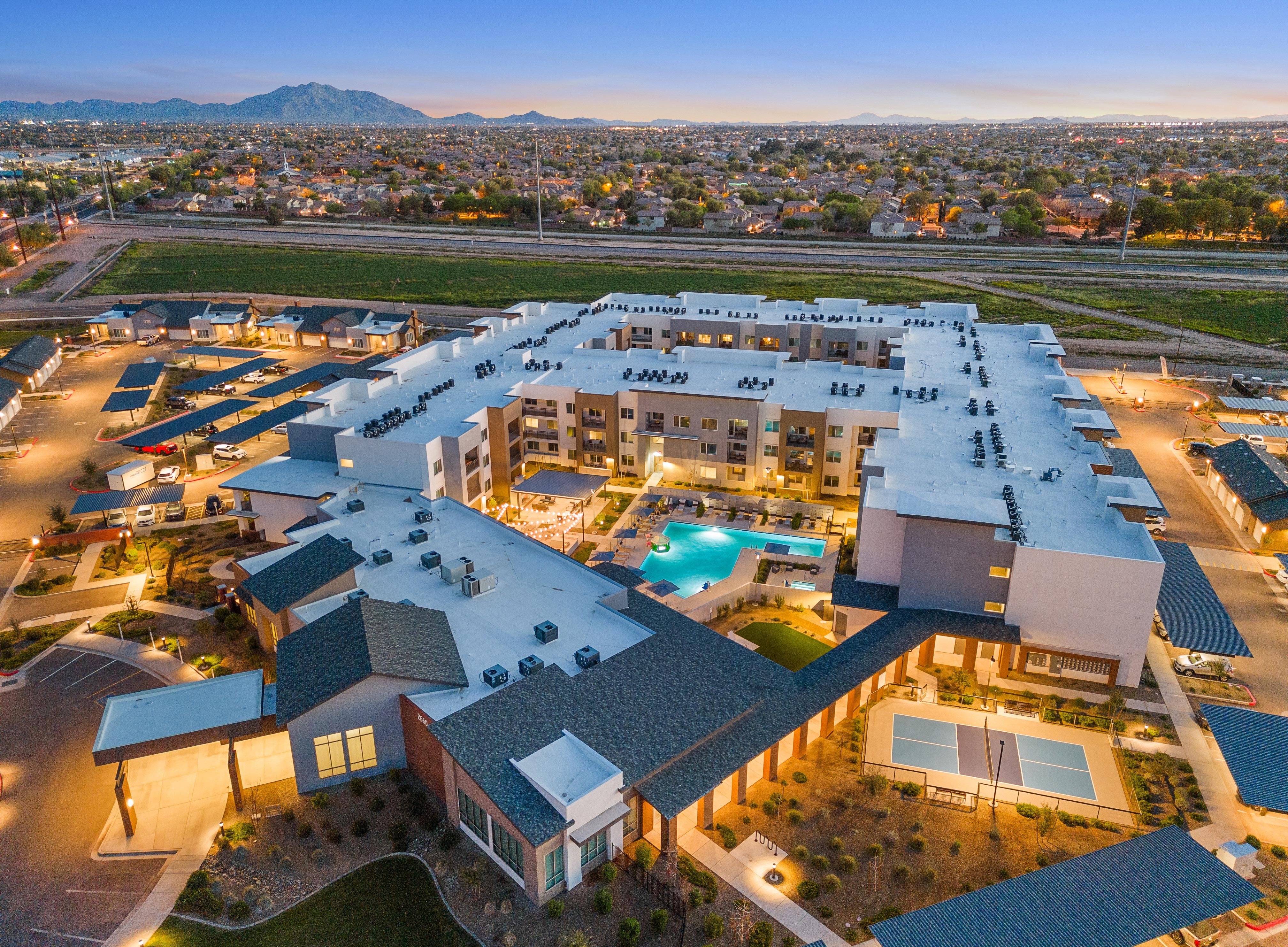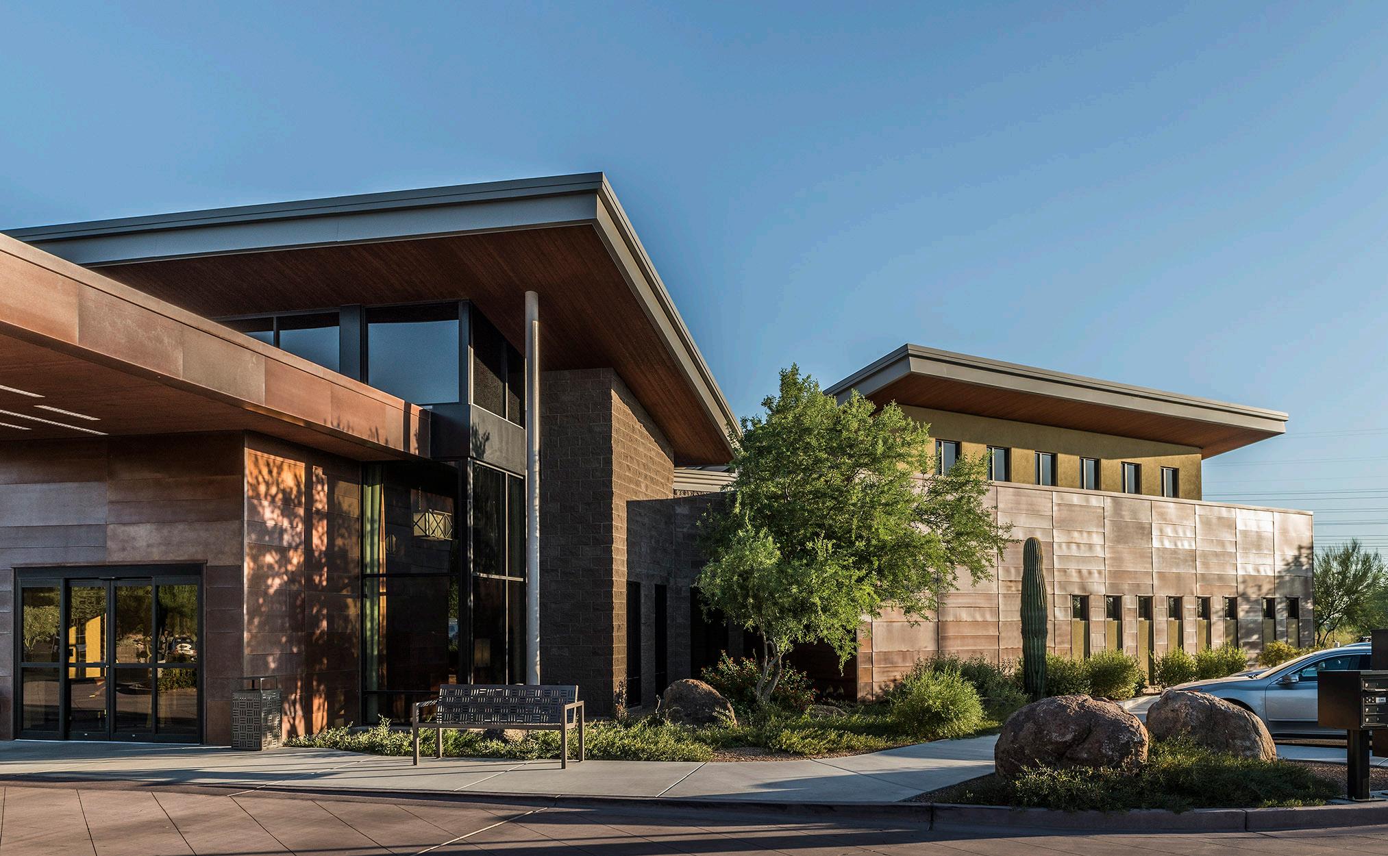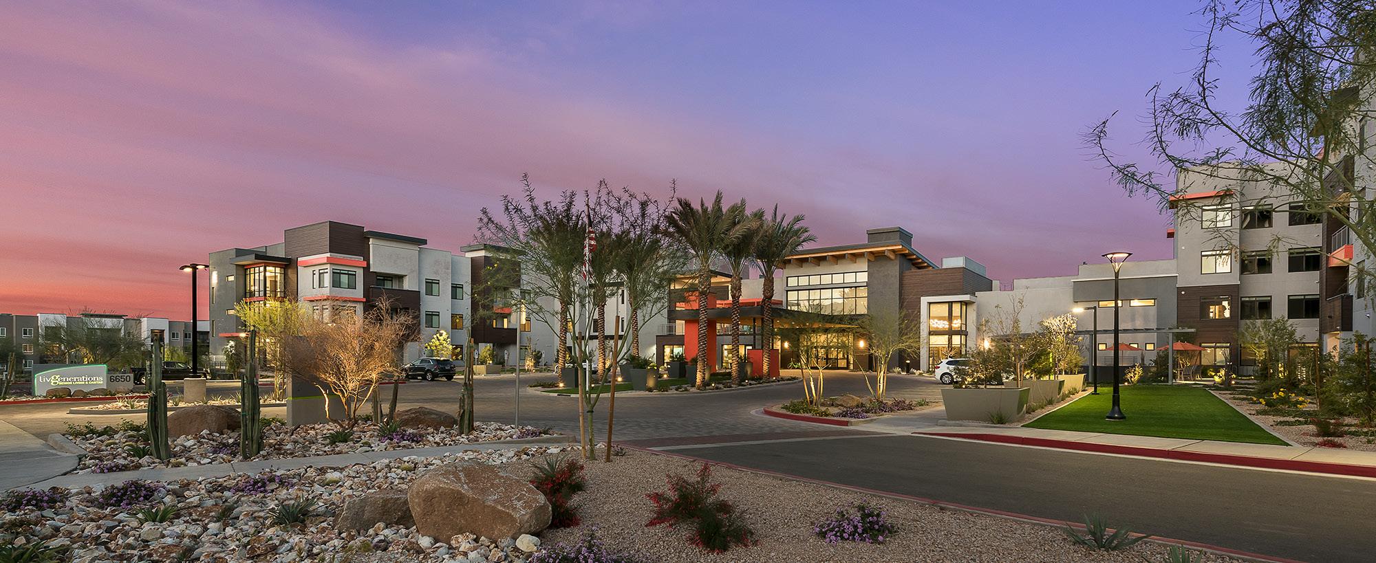 As an award-winning development, Clearwater Pinnacle Peak is a 110-unit resort-style senior living community tailored after its sister properties, Clearwater Agritopia and Clearwater Ahwatukee to reflect an active, upscale lifestyle. This community features 90 independent living/ assisted living units and 20 memory support units. Located in prime North Scottsdale, just north of the 101 freeway, Clearwater Pinnacle Peak replaced an iconic abandoned office building in an active development area. Adjacent to an established residential neighborhood, the site plan, program, and architecture integrated this community and its residents into an existing walkable environment, directly connecting them to a 2-level shared parking structure, restaurants, grocery store, and other retail shops.