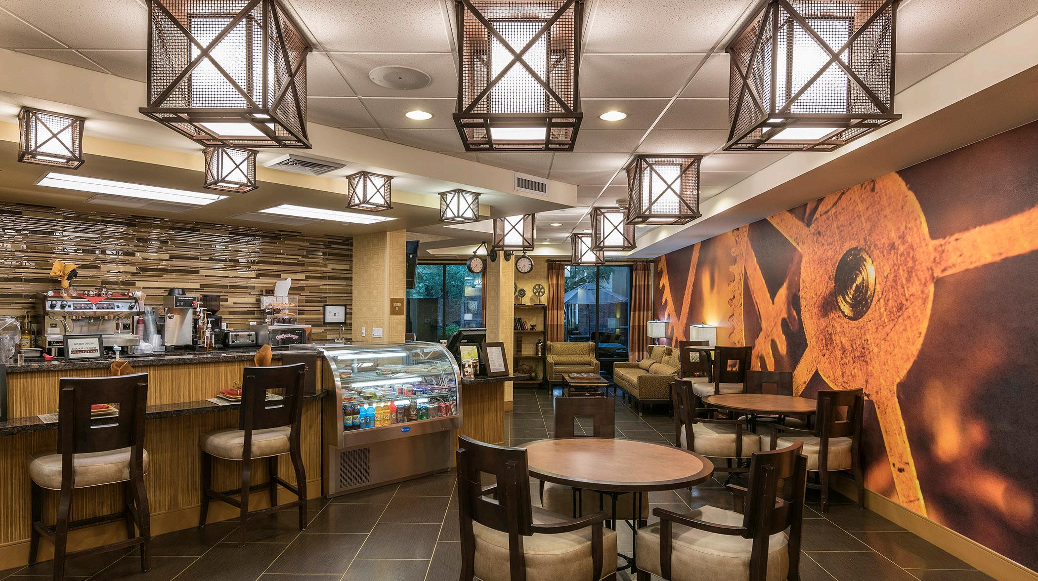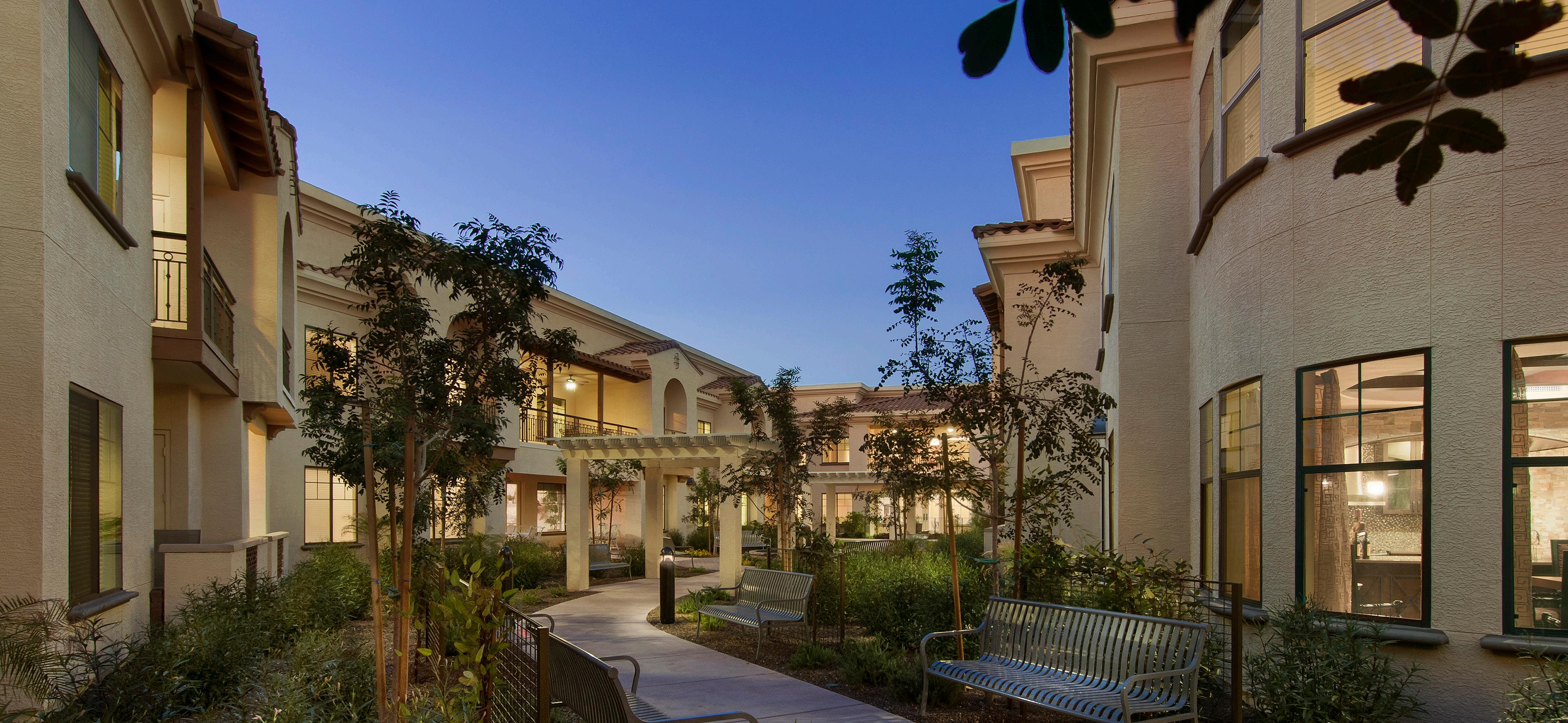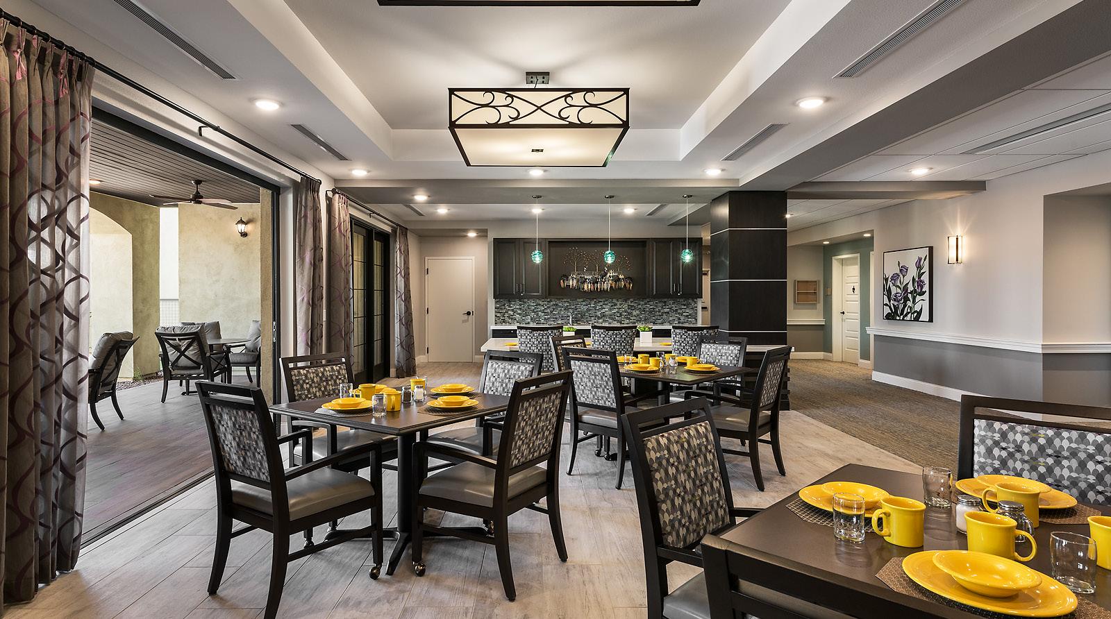 Amenities include several activity rooms, including an art studio, theater, game room, music room, and library/media room. There is both casual dining in the open bistro/café as well as a main dining room for more formal meals. Landscape design includes lush courtyards with walkways and seating areas. A separately secured courtyard was designed specifically for memory support residents.