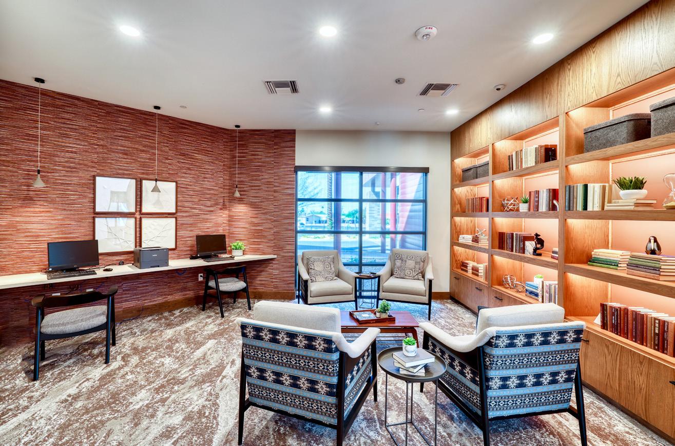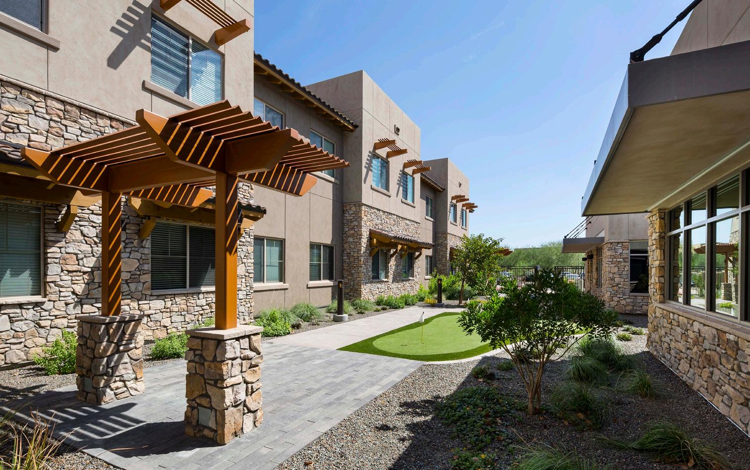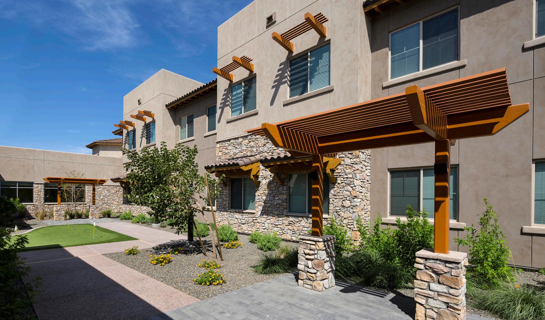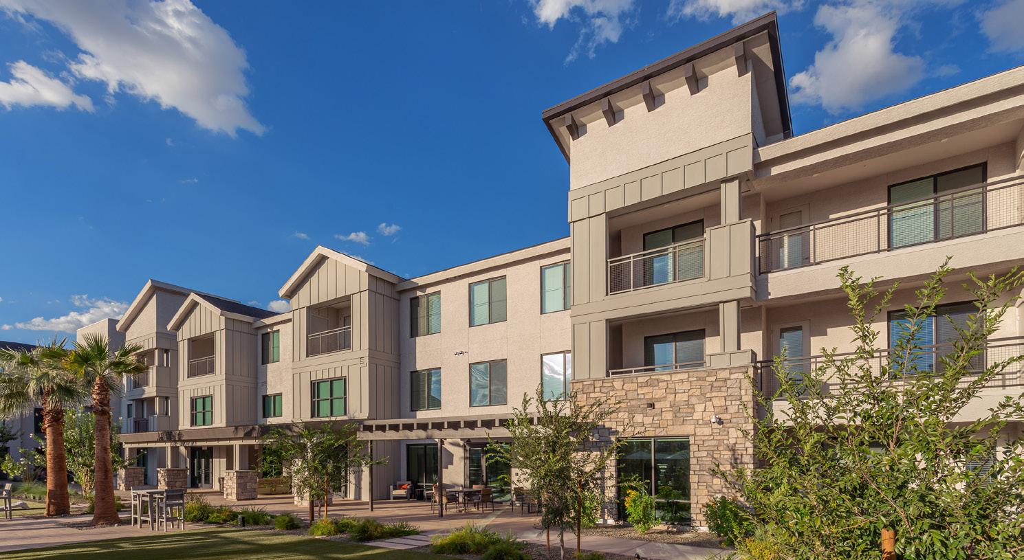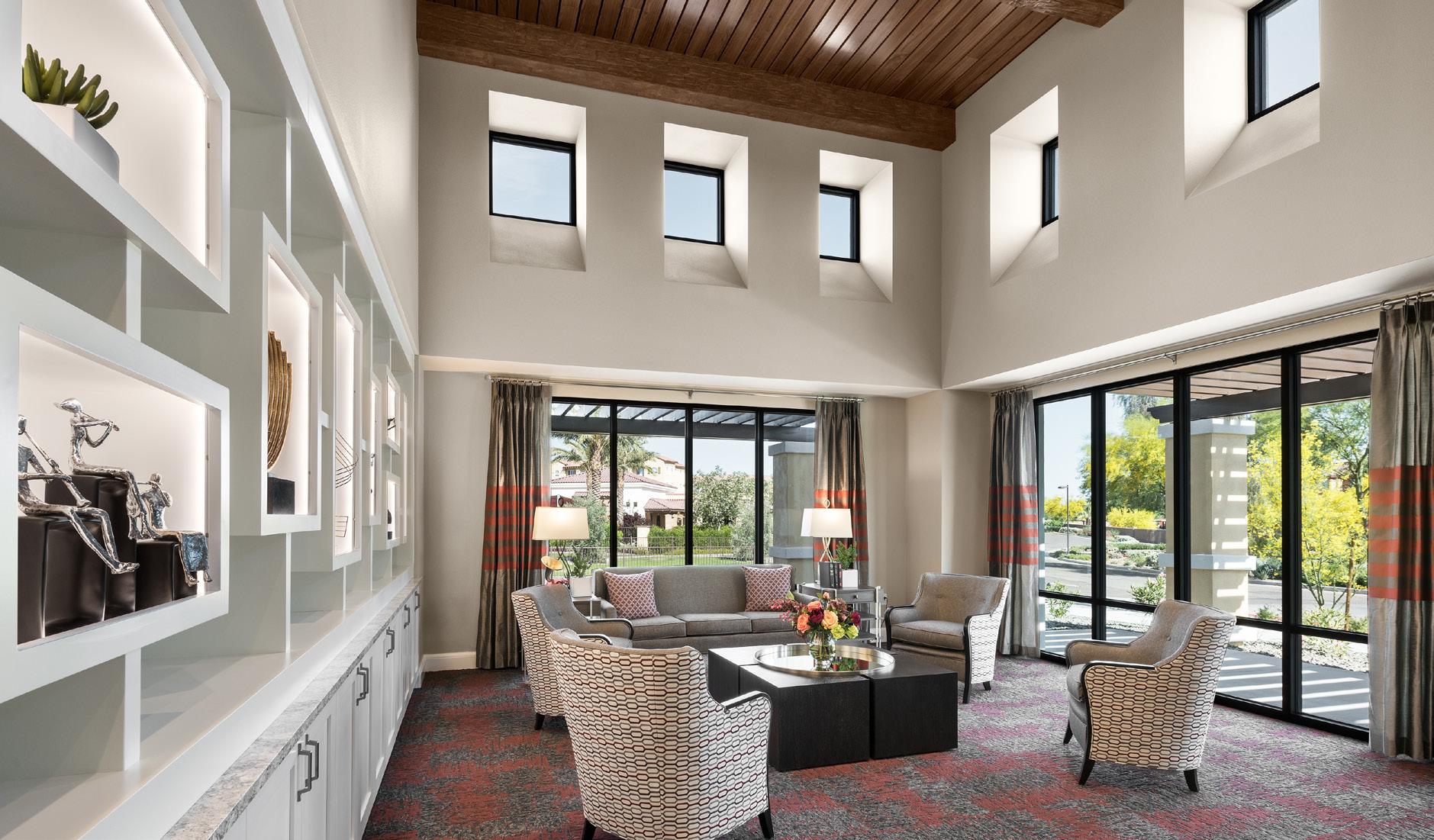 As the fourth community for this client within the greater Phoenix area, Clearwater Mayo Blvd is a 181-unit resortinspired senior living community. It is comprised of 26 high-end casitas, 125 independent/assisted living units, and 30 memory care units. Located off the 101 Freeway, it is integrated into the community near retail, restaurants, and healthcare with pedestrian walkways and outlets. The location is key, neighboring a 2-phase multifamily development, which creates a multi-generational community with a contemporary architectural design.