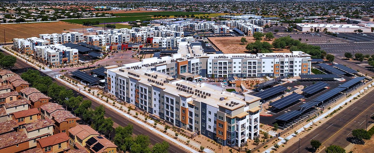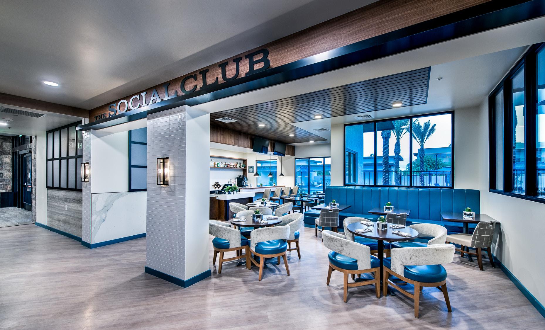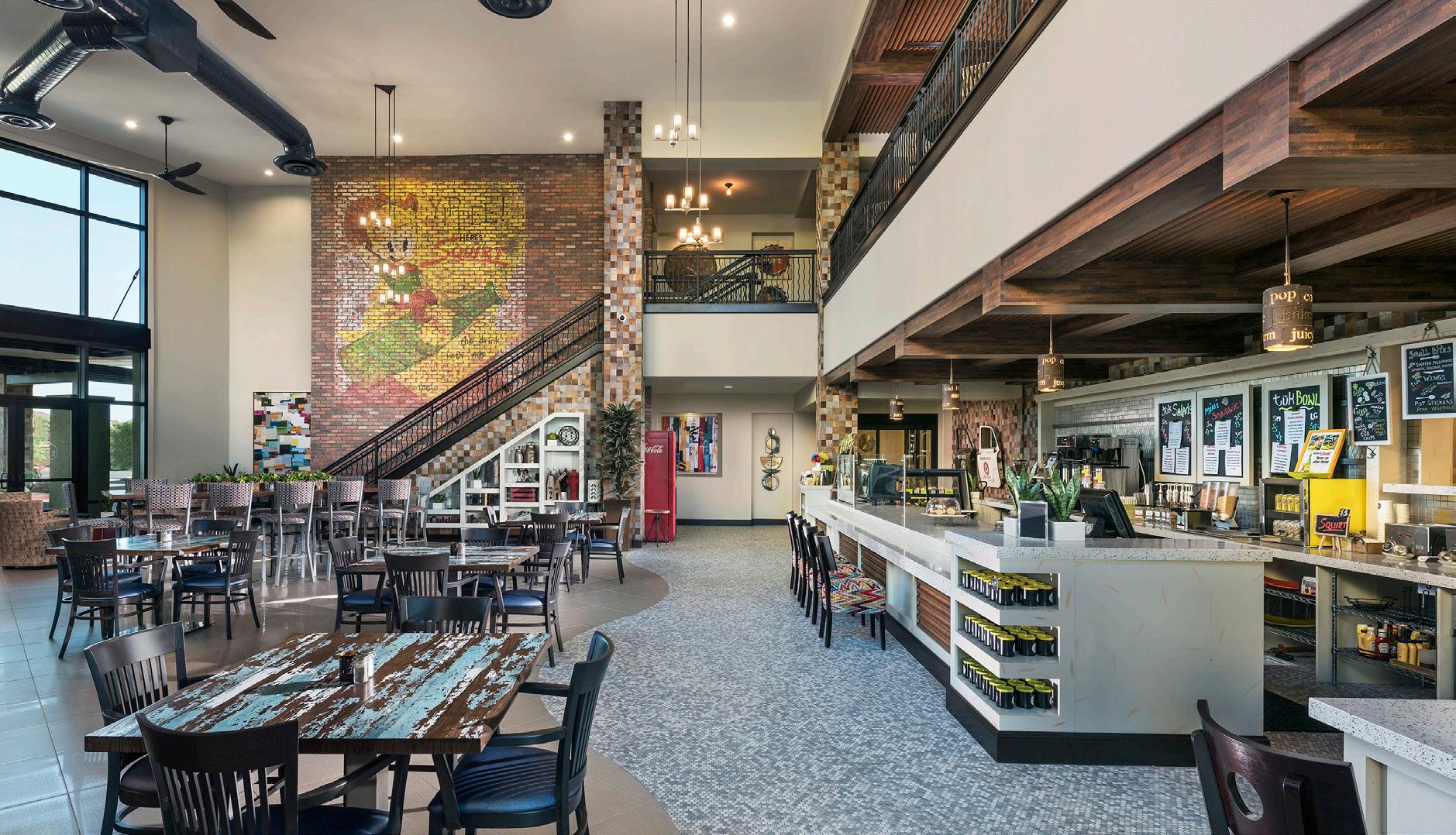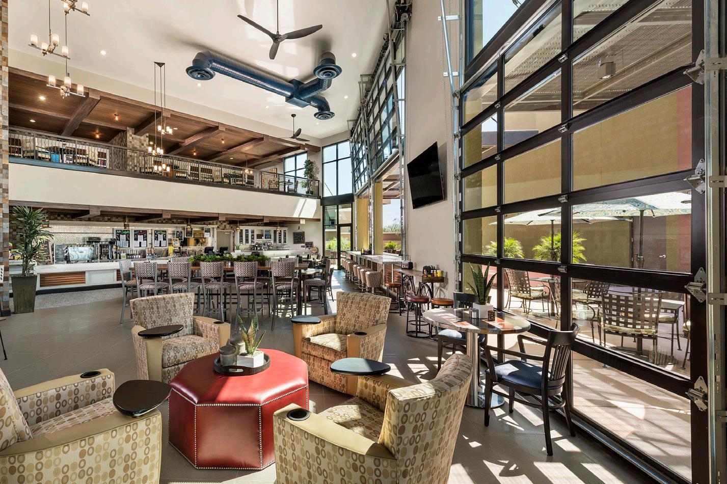 The Main Entry of Clearwater Ahwatukee creates a sense of arrival and connects directly to the Tuk Café, allowing for community connection. The 2-story Tuk Café is a inviting market cafe designed to include the surrounding community through walkways that connect to the adjacent neighborhood. This 4,100 SF café has floor to ceiling windows with a garage door that opens to the patio. On the 2nd floor, the luxury rooftop Sky Deck provides additional outdoor space for residents to relax and entertain. The Sky Deck is furnished with a fireplace, TV, BBQ, and lounge area.