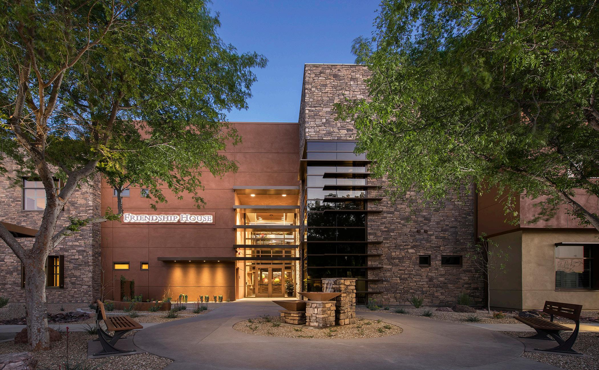 The new dining venues within the Health and Wellness Center provided a variety of options with a central dining room, marketplace grill, coffee bar, and an upscale, reservations only dining room. Additionally, private dining rooms were designed for private parties and family functions. Most recently built, Friendship House, is a 2-story memory support building that offers 56 private rooms as well as an ample centrally located living room, activities room, and dining area. Outdoor therapy gardens were designed to provide a variety of secure recreational spaces for the residents.