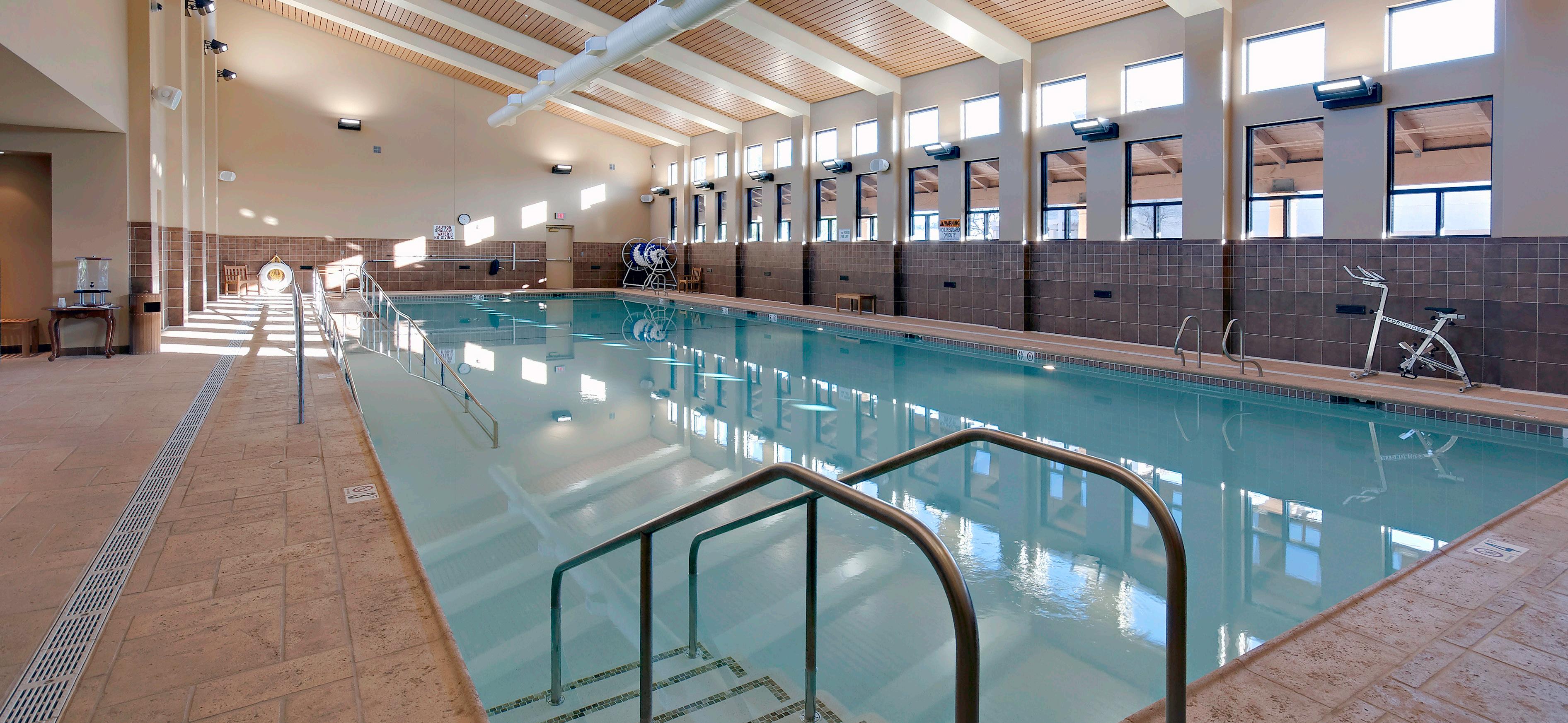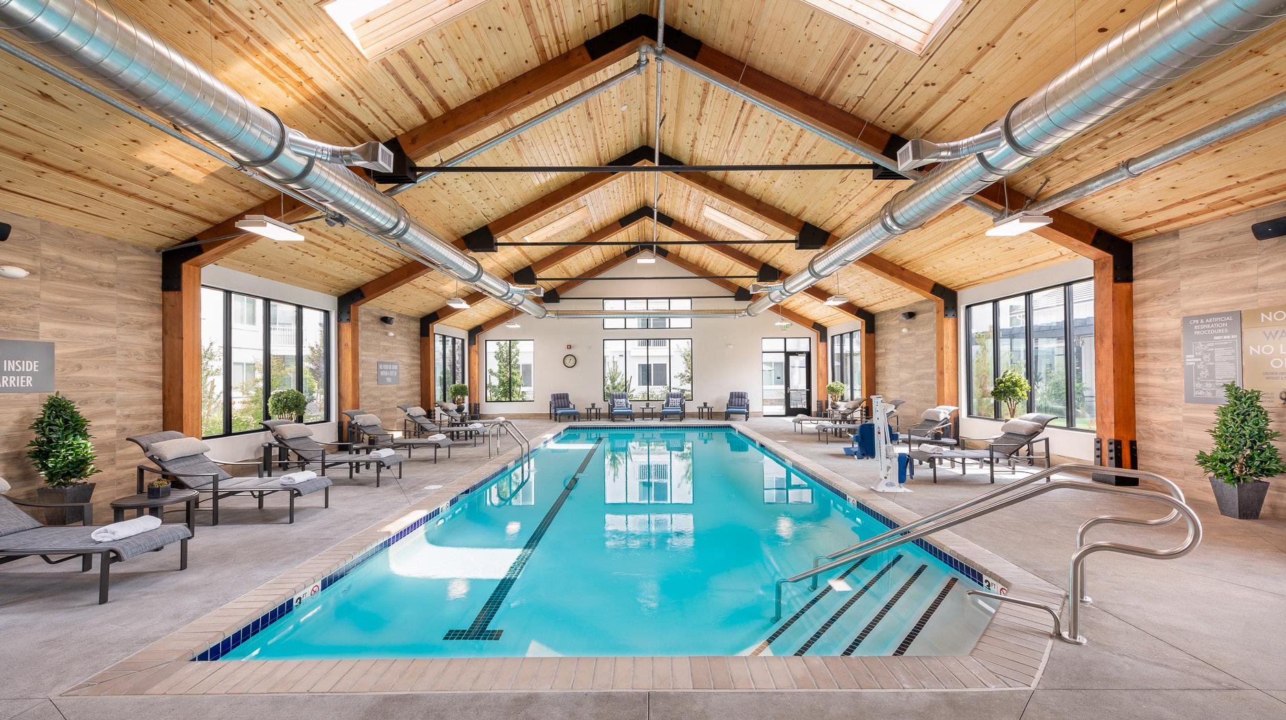 Renovation to the 59,110 SF Health Care Center resulted in converting the existing 122-bed double occupancy rooms into 66 private suites. The goal was to create the best layout for the 4 stations that make up the skilled care center, as well as evaluate internal uses and their relation to the campus dynamics. In later years, the Health and Wellness Center was designed to provide a space that promotes healthy living. Key features include a motion studio, fitness center, massage rooms, and an indoor lap pool. Also a beauty salon, locker rooms, and an outdoor walking pool.