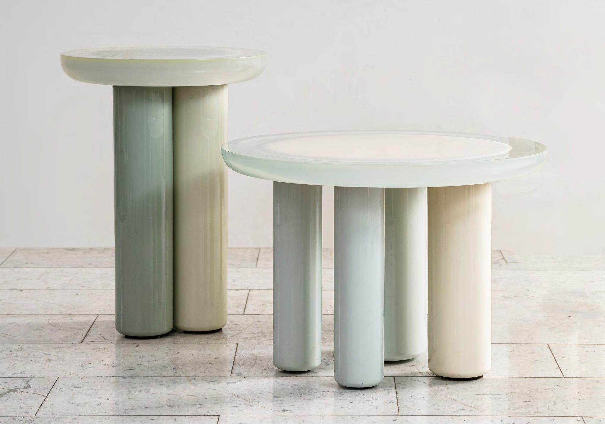 His Orbit Occasional Tables marry visual motifs of retro futurism and highend French decorative arts techniques (marquetry, lacquer) learned from his father. Each is customizable in size, transparency, and a full spectrum of colors, The possibilities for combinations, arrangements, and colors of the resin are endless, rendering each piece completely unique.