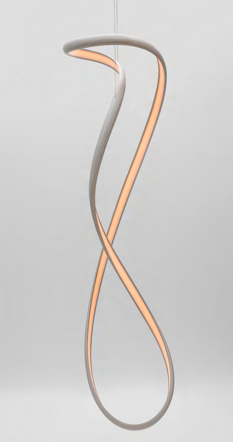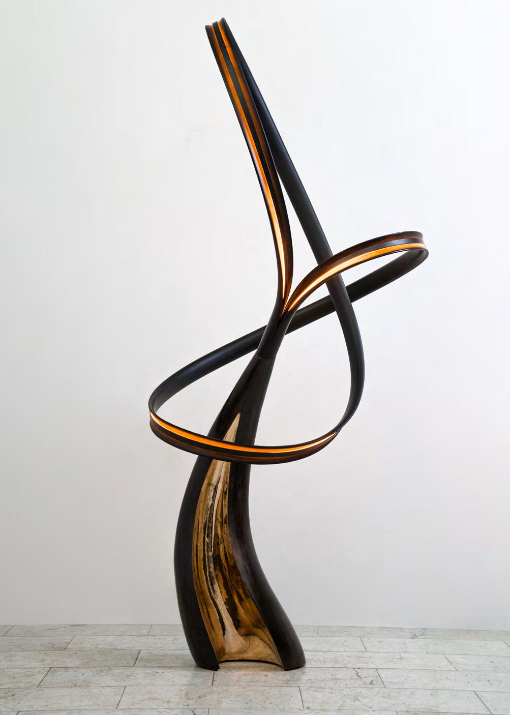 The collaborative sculpture “Anthropose” by John Procario and Alex Roskin stands as a monumental work of art, marrying Procario’s expertise in bent wood with Roskin’s mastery of bronze sculptural furniture. Standing over 7 feet tall, the sculpture harmoniously combines wood, bronze, and LED technology, embodying its essence through a human-like stance that invites viewers to discern subtle echoes of movement and gesture within its curvilinear contours. Procario’s contribution, a sinuous ribbon of blackened bent wood, is accentuated by hidden LEDs, casting dynamic shadows and illuminating the sculpture with a warm glow. Roskin’s signature trunk-like bronze base anchors the piece, revealing a polished interior that adds depth and elegance to the sculpture’s overall presence.