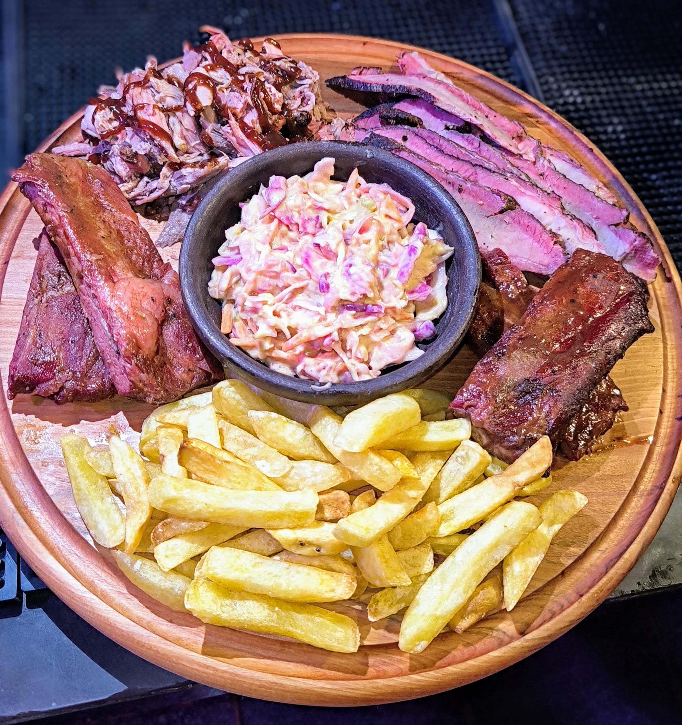 Brisket, Pulled Pork, Costillas BBQ, Coleslaw y papas fritas