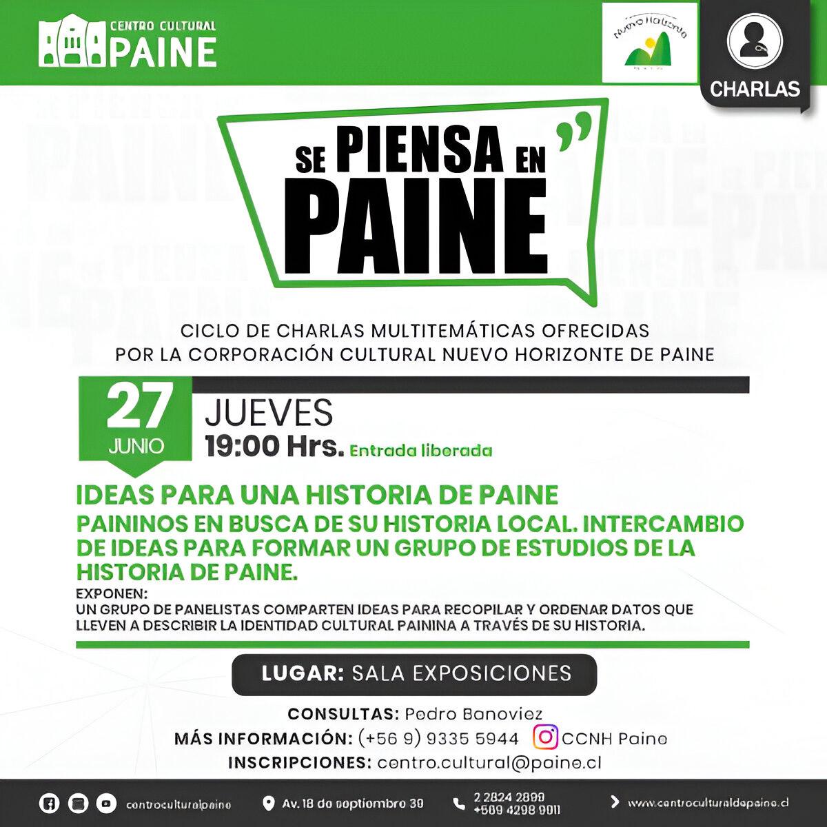 Para concretar este interés, se estableció dedicar la edición de junio 2024 de “Se Piensa en Paine”, el ciclo de charlas multitemáticas ofrecidas por la Corporación Cultural Nuevo Horizonte de Paine, para intercambiar ideas y sugerencias que conduzcan a la formación de un Círculo de Estudios dedicado a la historia y la identidad painina. Los invitados son todos aquellos voluntarios interesados en colaborar, sean vecinos de Paine o personas relacionadas con la comuna.
