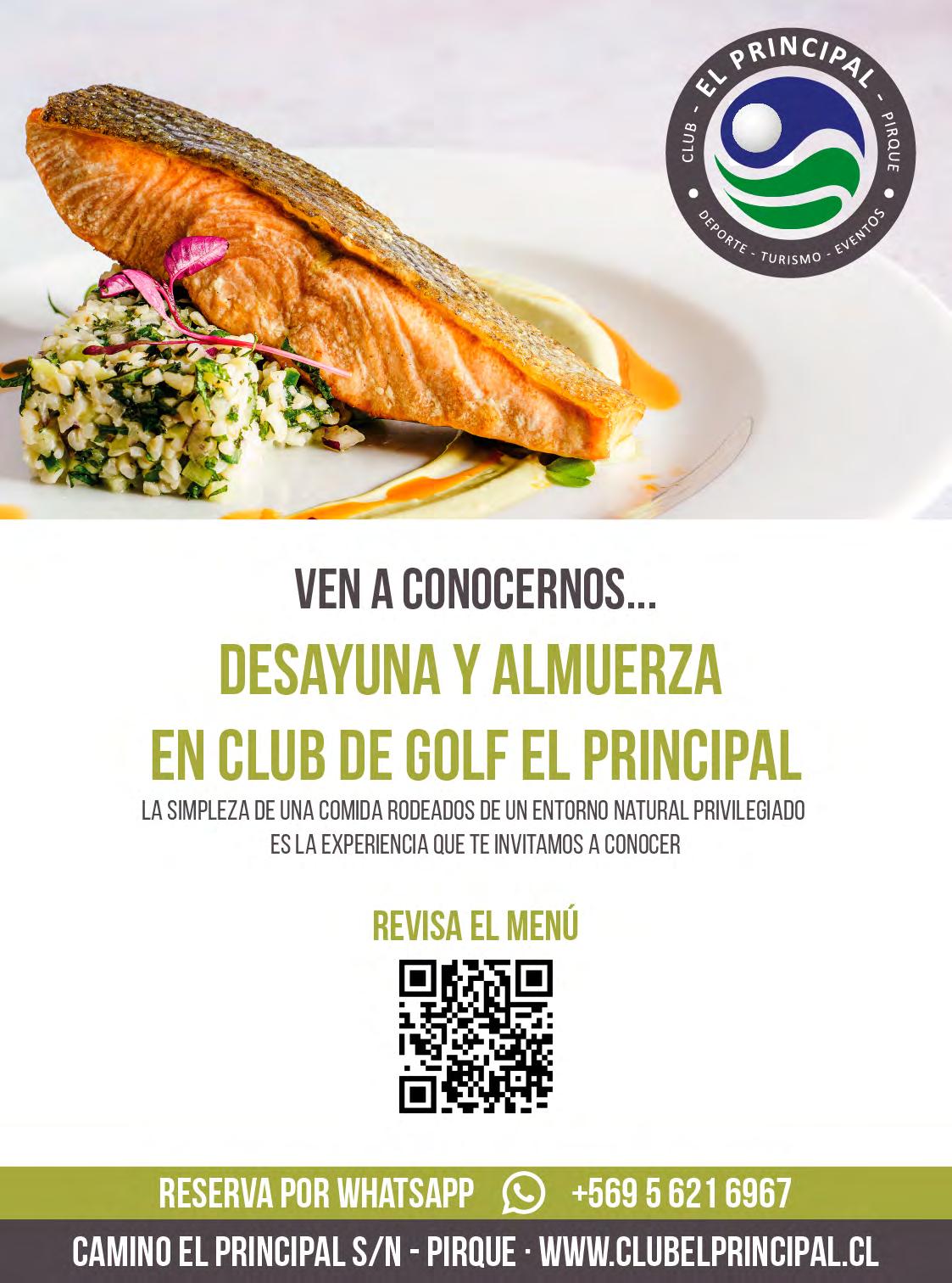 Suministro e instalación de Sistema de Tratamiento para Agua Potable, Aguas Grises y Aguas Servidas Diseño y Construcción de Piscinas Naturales y Lagunas Artificiales Sistemas de Filtración Sistemas de Desinfección Tratamiento de Riles Tratamiento de Olores www.polyedro.cl +569 8159 7041 polyedro@polyedro.cl www.polyedro.cl polyedro_tratamiento_aguas TE INVITAMOS A INICIARTE EN EL GOLF EN NUESTRO CLUB reservas: info@clubelprincipal.cl +569 6238 5445 www.clubelprincipal.cl @clubelprincipal Clases para principiantes sin necesidad de adquirir equipos