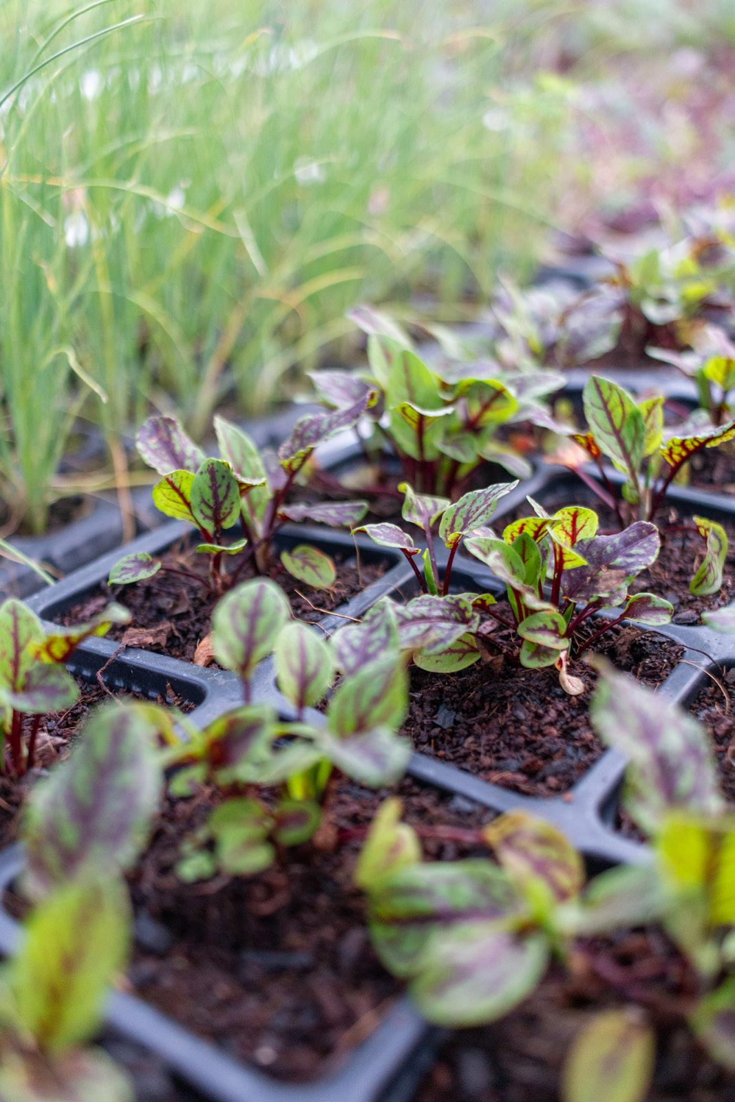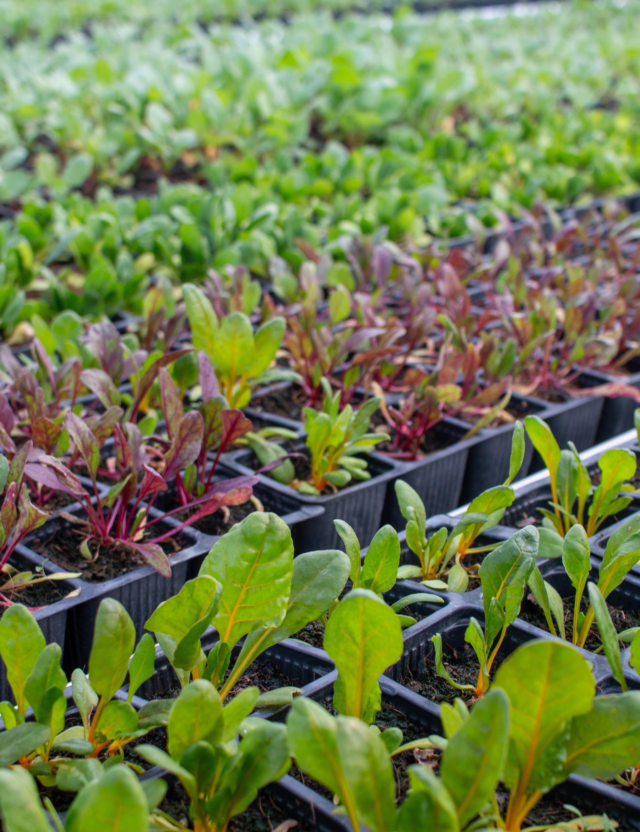 Almácigos de: brócoli, habas, apio, berros, kales, acelgas de tallo amarillo, naranja y roja, puerros, betarraga roja, candy cane y falcon, rúcula, rábano francés, tatsoi, mizuna verde, romanesco, coliflor, bruselas, zanahorias en diversas variedades, amaranto, romero, y muchas otras más.
