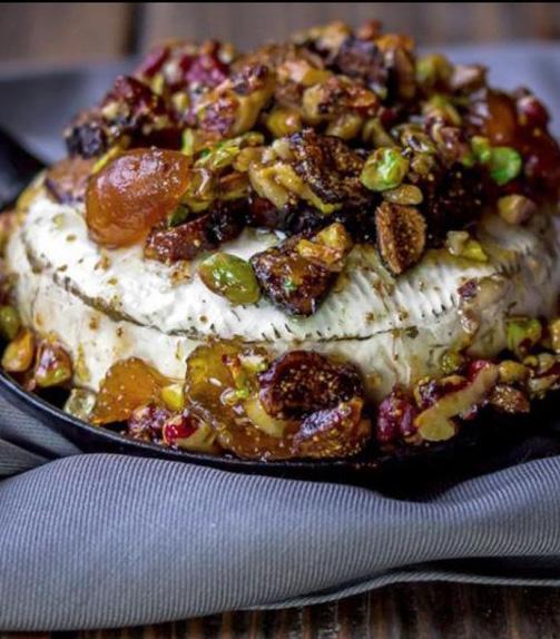 · Poner el queso brie sobre una asadera y sobre el agregar la mezcla de frutos secos, fruta y miel.