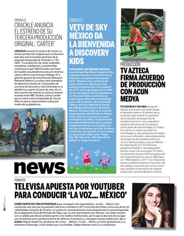 TELEVISA APUESTA POR YOUTUBER PARA CONDUCIR ‘LA VOZ... MÉXICO’ COMO PARTE DE UNA ESTRATEGIA para conseguir más espectadores, ‘La Voz… México’ será conducido este año por la youtuber Lele Pons, incluida en 2017 en la lista de Forbes como una de las 30 celebridades menores de 30 años. La noticia se conoció durante el lanzamiento de la nueva temporada de la adaptación local del formato de Talpa, que se verá nuevamente por Televisa. “Las redes sociales son un aliado para llevar también gente a los medios tradicionales, por lo que la decisión de escoger a la venezolana será una buena forma de refrescar el proyecto, y conseguir nuevas audiencias”, dijo a todotv Miguel Ángel Fox, productor de La Voz… México. ‘La Voz… México’ ya inició grabaciones y se estrenará el domingo 14 de octubre por Las Estrellas. Odalys Ramírez será la co-conductora.
