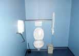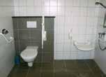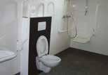 Er is een aangepast toilet met voldoende opstelruimte naast (84 cm), voor en schuin voor het toilet. Er zijn beugels voorzien.