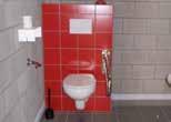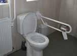 Je gebruikt het toilet in de gemeenschappelijke badkamer. Dat biedt voldoende ruimte en is uitgerust met (wat korte) beugels.