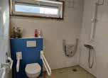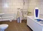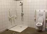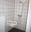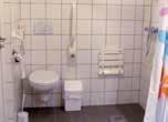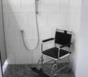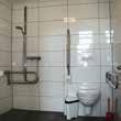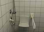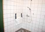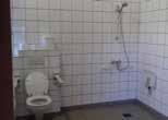 1 toegankelijke kamer (nummer 11 met 4 toegankelijke bedden) (foto 2). Kamer 10 is identiek maar de deur is hier maar 76 cm breed. In de badkamers op de gang achter het café en bij de slaapkamers is er een inrijdbare douche met douchezitje en beugels (foto 3). Voldoende opstelruimte naast, voor en schuin voor het zitje. Ook het toilet heeft voldoende opstelruimte en beugels. De wastafel is onderrijdbaar.