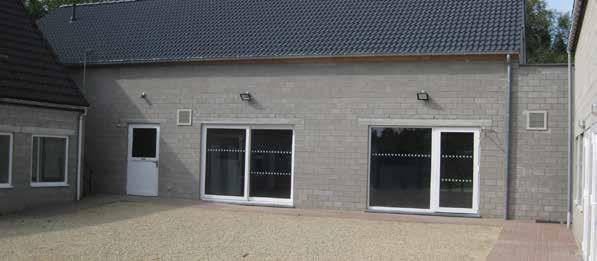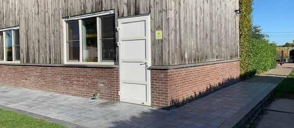 Toegangspad, ingang en onthaal Toegankelijk via een lang hellend vlak (foto 1). Je kan hulp nodig hebben bij het openen van de dubbele deur. Er is voldoende circulatieruimte.