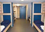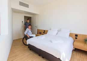 Geen specifiek aangepaste kamers, maar 32 toegankelijke bedden in gewone slaapkamers. De kamer- en badkamerdeur is 78 cm breed. Aan de deur, tussen de bedden en aan de kast is de draairuimte nipt, maar bruikbaar. De aangepaste badkamer op de gang heeft een inrijdbare douche met verplaatsbare douchestoel met afneembare armleuningen. De draairuimte en de opstelruimte naast en voor de stoel zijn beperkt, maar bruikbaar. Het toilet heeft beugels en voldoende opstelruimte. De wastafel is onderrijdbaar.