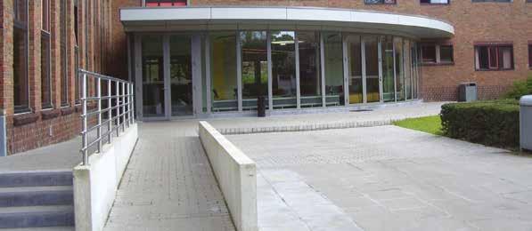 Het brandalarm geeft ook een visueel signaal. Op het toegangspad zijn er goed volgbare natuurlijke geleidelijnen. Er wordt binnen met visuele contrasten gewerkt.