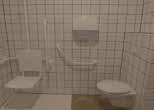 Kasteel: voldoende opstelruimte naast, voor en schuin voor het toilet. Er zijn beugels voorzien. Koetshuis: circulatieruimte beperkt, maar voldoende voor praktisch gebruik.