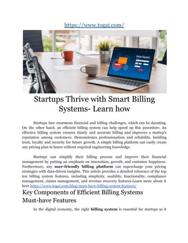 Togai is the most flexible billing system for B2B SaaS companies. We support all kinds of pricing models under the sun such as: -Subscription based pricing -Seat based pricing -Usage-based pricing -Tiered pricing -Hybrid pricing Togai also helps companies offer prepaid credits within their app. Automate your internal billing workflows now. Get creative with pricing and start for free with Togai!