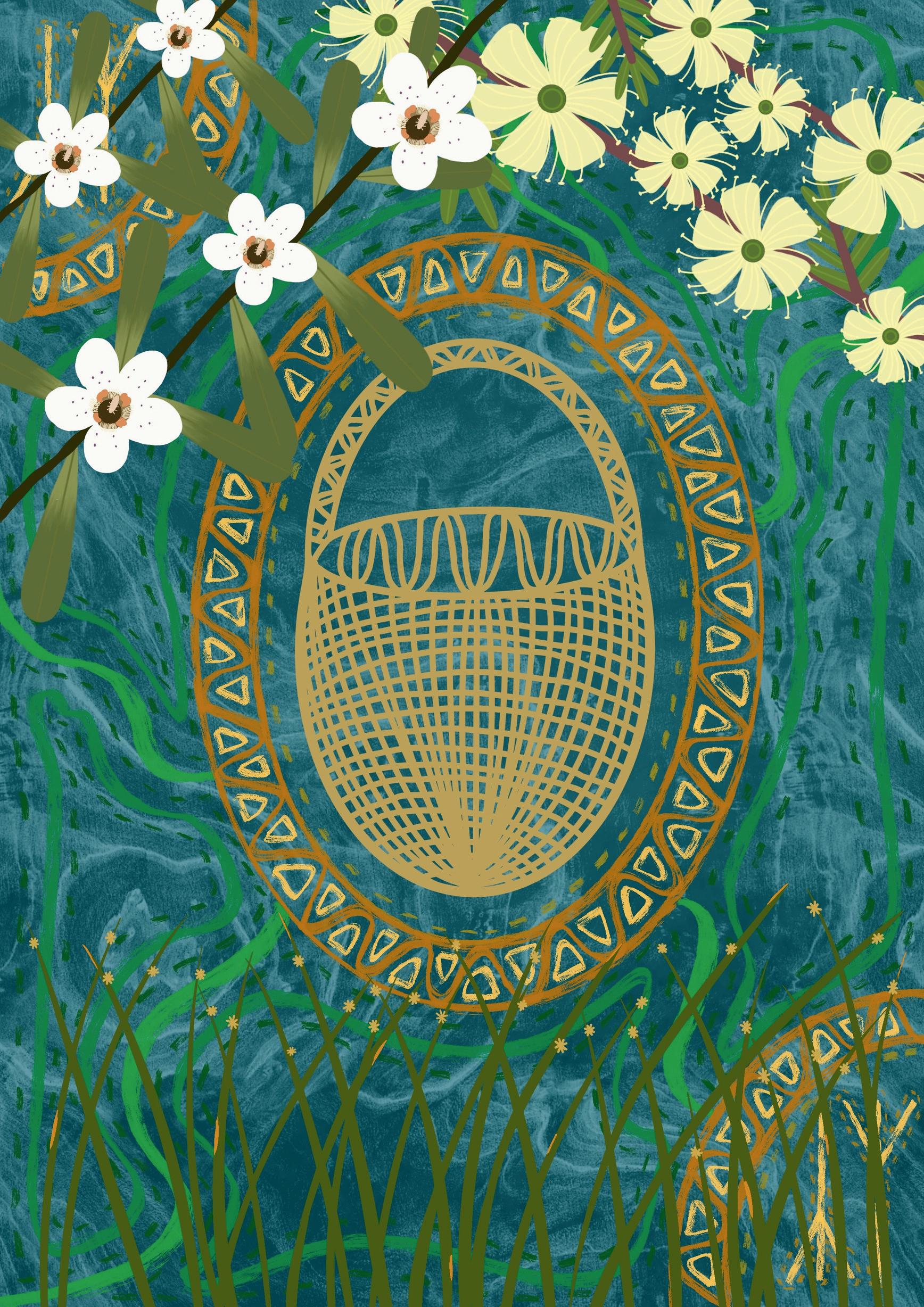 This design draws inspiration from native Tasmanian plants, corkwood for Launceston, kunzea for Nipaluna/Hobart, and boobialla for Pataway/Burnie, symbolising deep roots and regionalidentity.Atitsheartisthewovenbasket,a metaphor for strength and integrity: each strand must be placed with care, and mistakes corrected to preserve its structure. Just as weaving requires patience and precision, creating culturally safe spaces demands ongoing effort and accountability. This artwork represents TUSA’s commitment to repairing and reinforcing its “basket”—its community—so that all students feel safe,supported,andrespected.
