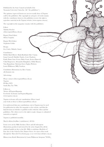 Published by the State Council on behalf of the Tasmania University Union Inc. (hf. “the publishers”). The opinions expressed herein are not necessarily those of Togatus staff or the publishers. The copyright in each piece of work remains with the contributor; however, the publishers reserve the right to reproduce material on the Togatus website (www.togatus.com.au) The copyright in this magazine remains with the publishers. Editor: Tabitha Fletcher editor.togatus@utas.edu.au Deputy Print Editor: Olivia Congdon Deputy Web Editor: Stephanie Eslake Design: Jess Curtis, Mahalee Smart Contributors: Debbie Baird-Bower, Mark Buckland, Alice Camm, Liam Carswell, Maddie Charles, Essie Charlotte, Emily Dunn, Isaac Foster, Ruby Grant, Jessica Hancock, Colin Hargreaves, Alexandra Humphries, Holly Monery, Vino Rajandran, Christian Street,Topher Webster, Laura Wilkinson, Milly Yencken. Contributor illustrations by Alice Camm. alicekazam.com Advertising: Please contact editor.togatus@utas.edu.au Togatus PO Box 5055 Sandy Bay, Tas 7006 Follow us: Twitter: @TogatusMagazine Facebook: facebook.com/TogatusMagazine www.togatus.com.au Togatus welcomes all your contributions. Please email your work or ideas to editor.togatus@utas.edu.au It is understood that any contributions sent to Togatus may be used for publication in either the magazine or the website, and that the final decision on whether to publish resides with the editor and the publishers. The editor reserves the right to make changes to submitted material as required. Togatus is published monthly. March edition deadline (contributors): 28 Feb Front cover art by Milly Yencken. These and all subsequent illustrations produced and owned by the artist. Inspired by all the awkward quirks in day to day life, Milly is studying a Bachelor of Fine Arts at the School of Art, Hunter Street. See more of her work through her ‘Barcoded’ Facebook page, or at: www.barcodedart.com.au Rhinocerous Beatle Illustration by Laura Wilkinson: Instgram 7AURA_