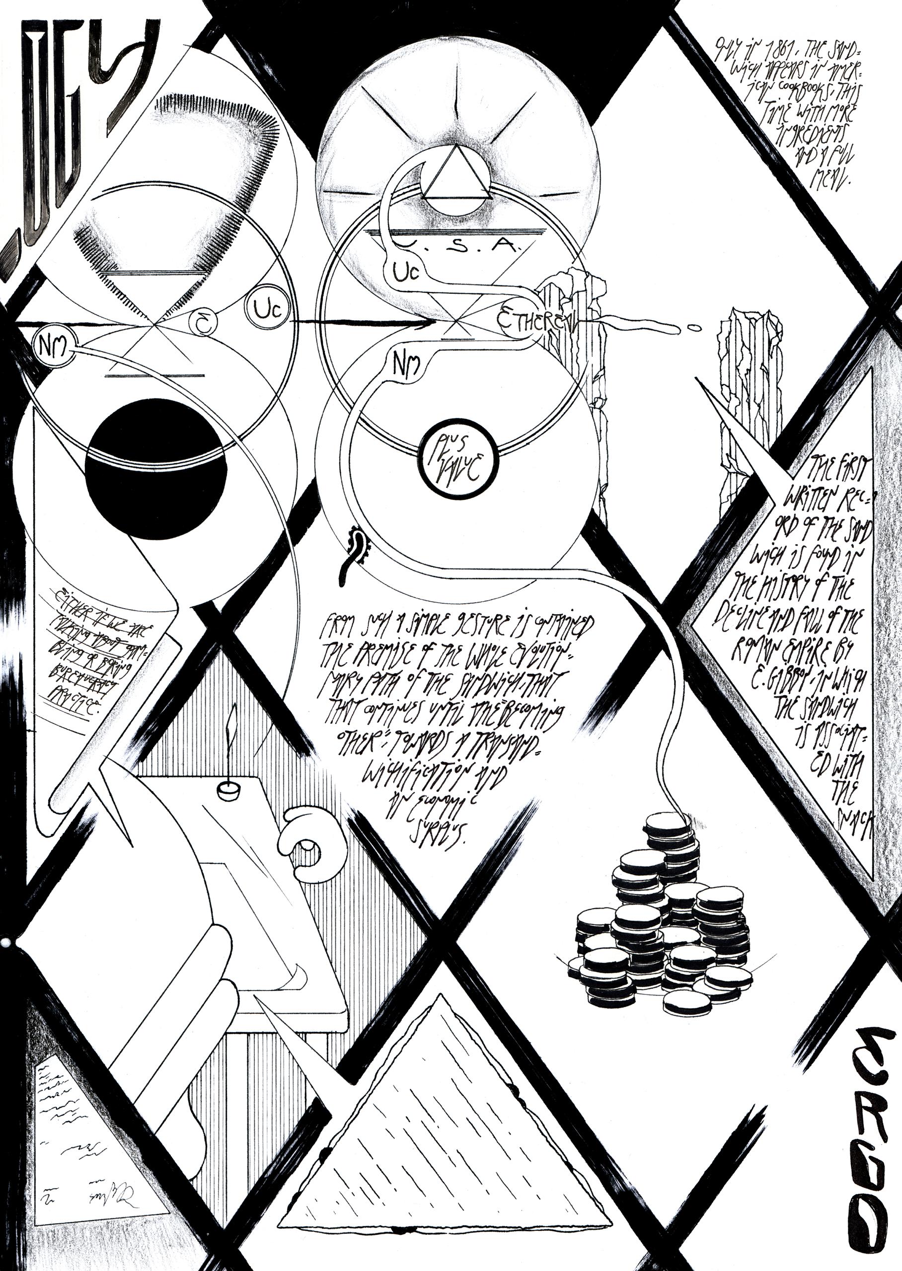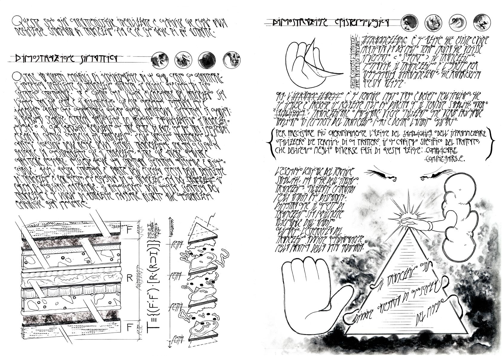 In The Sandwich Guide: a Georomantic Essay through the Ethereal Un-candy, the sandwich is an excuse to talk about what’s behind a theme as (apparently) simple as the sandwich, in particular its nonculinary and, in a sense, speculative aspects: how a simple idea can be and cannot be universally shared by the individuals, the language and the rhetorics of overcomplicating and contradictory discourse. It is also a work on different registers, that of the critical theory, of the logical mysticism, of the fanzine and, most of all, of the comics and the sequentiality of a collection of images, with which I tried to create a non-fictional kind of comic.