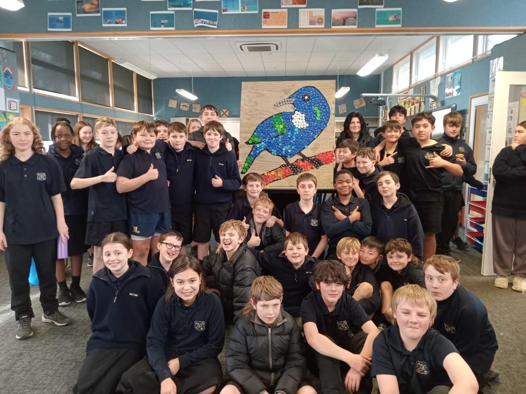 As part of our Conservation topic this term the Homeroom classes collected plastic bottle tops. With the help of Mrs McIntyre who drew our Tui outline we used hammer and nails to put each bottle top in place. We are so happy with how it looks and now just need to find the right space for it to go up on display!