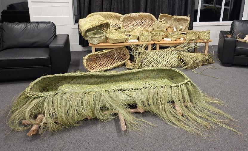 The group, who started with varying skill levels, wanted to learn to weave a burial casket, two different forms of baby baskets, big carry-all bags, baskets for placentas, and clay flutes for pregnant whānau to play to baby. The aim was to have a resource in the area, a group of people who can come together when needed to meet the needs of their local community and was inspired by a funeral/ tangihana workshop funded by Tokomairiro Waiora.