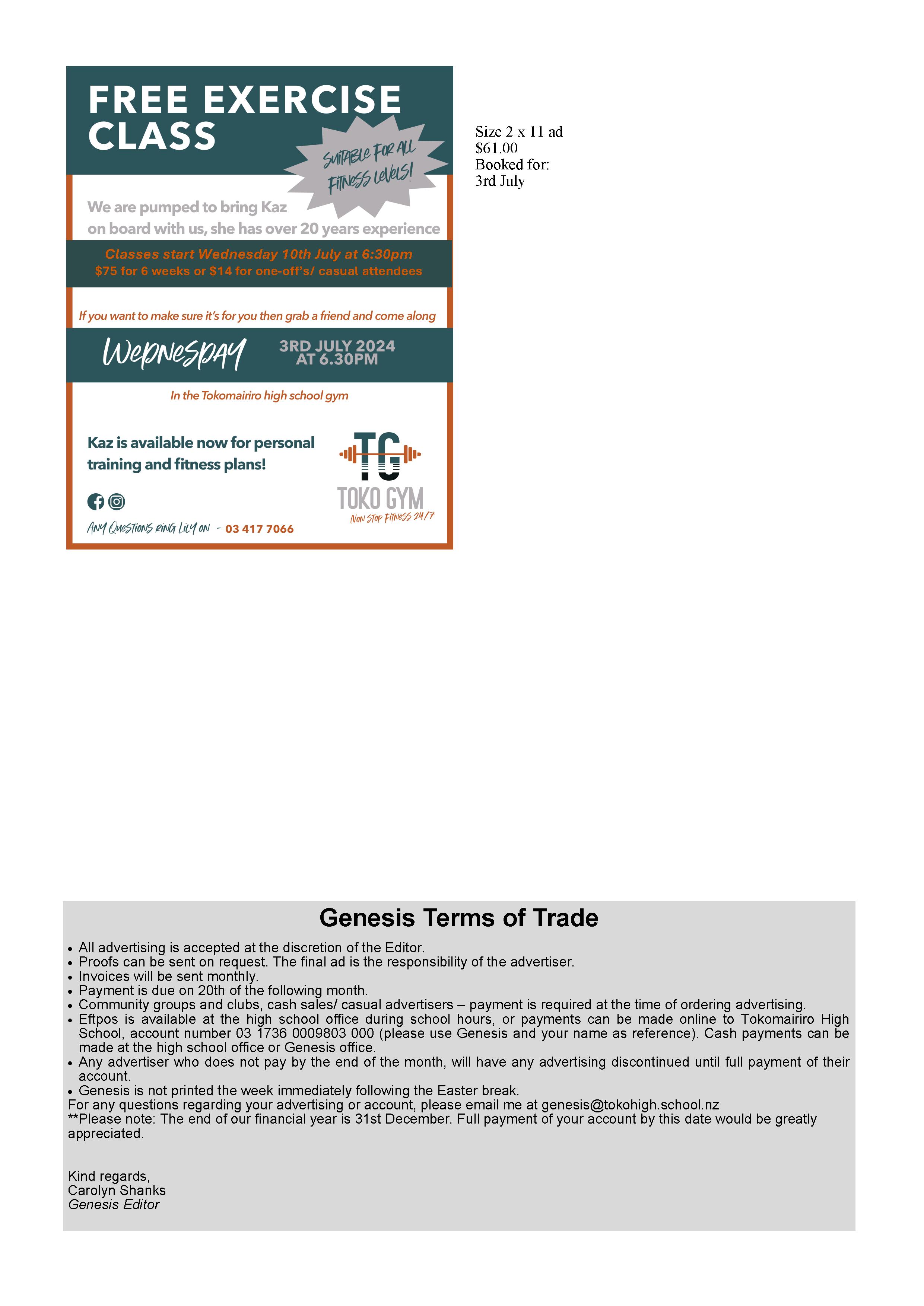 Genesis Deadlines: Advertising and Articles - Monday 12 noon. These can be emailed to the Editor at genesis@tokohigh.school.nz. Genesis is delivered FREE to your letterbox on Wednesday afternoons. Any payments or donations can be made to Tokomairiro High School, account number 03 1736 0009803 000. Please use GENESIS and your name as reference. - Carolyn Shanks, Genesis Editor