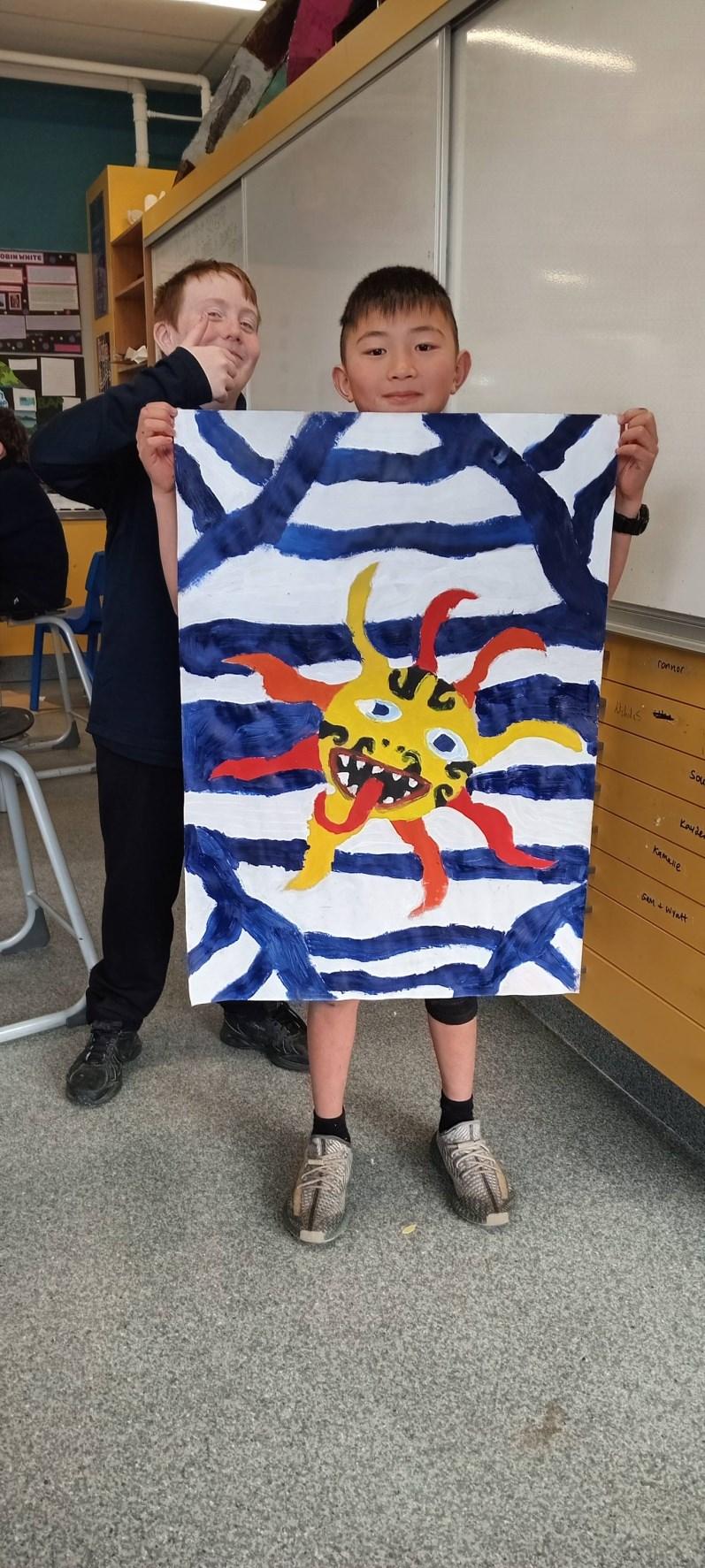 Khan Armstrong (left) and Carson Sun proudly display their poster of Tama-nui-te-rā (the sun).
