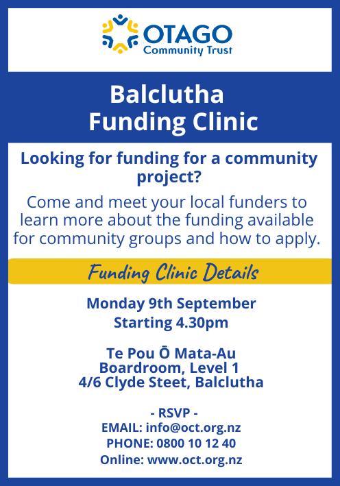 For application forms or more information go to: www.cluthafoundation.org.nz or email givewhereyoulive@cluthafoundation.org.nz