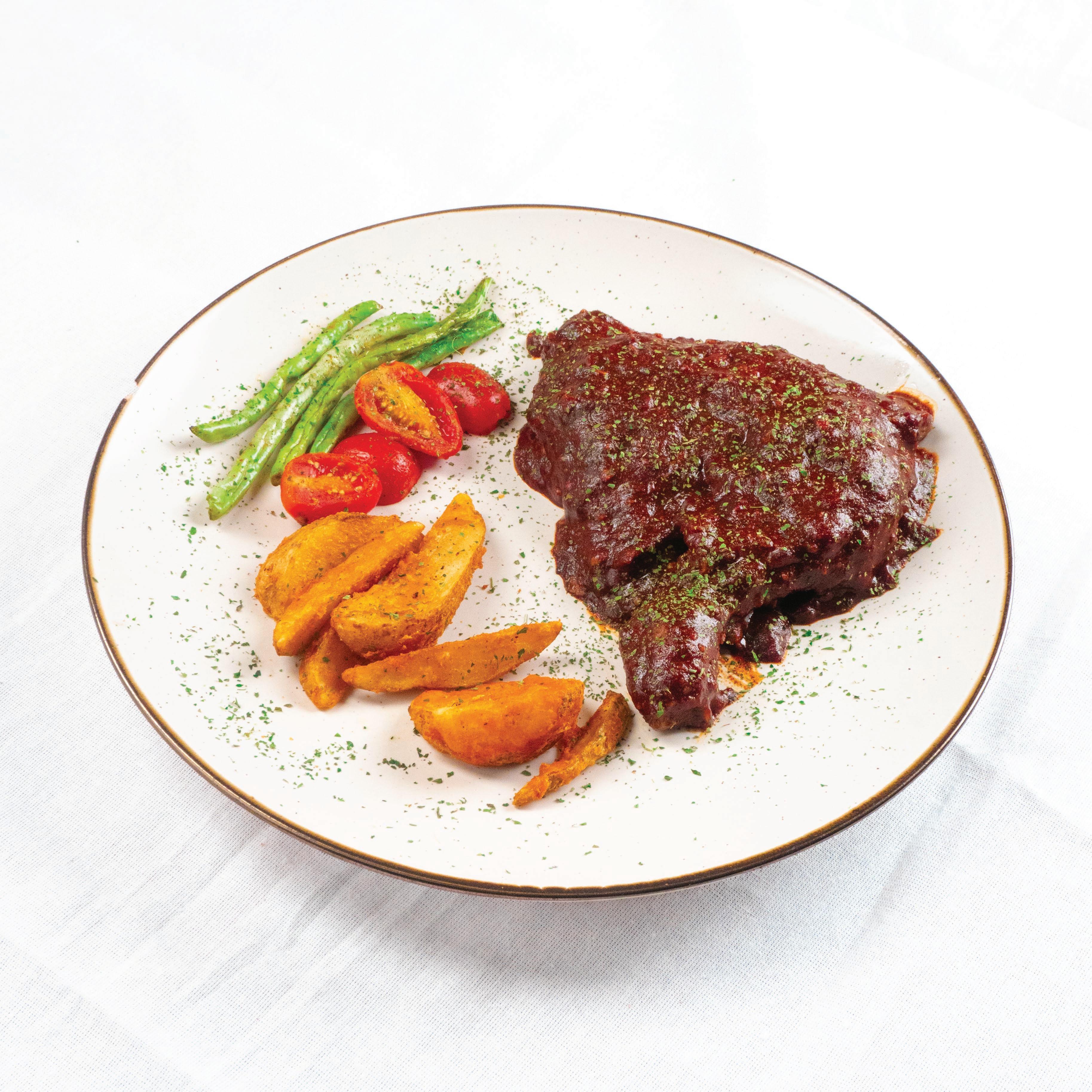 Juicy chicken glazed in our signature smoky BBQ sauce, served alongside perfectly roasted asparagus, ripe cherry tomatoes, and crispy potato wedges.