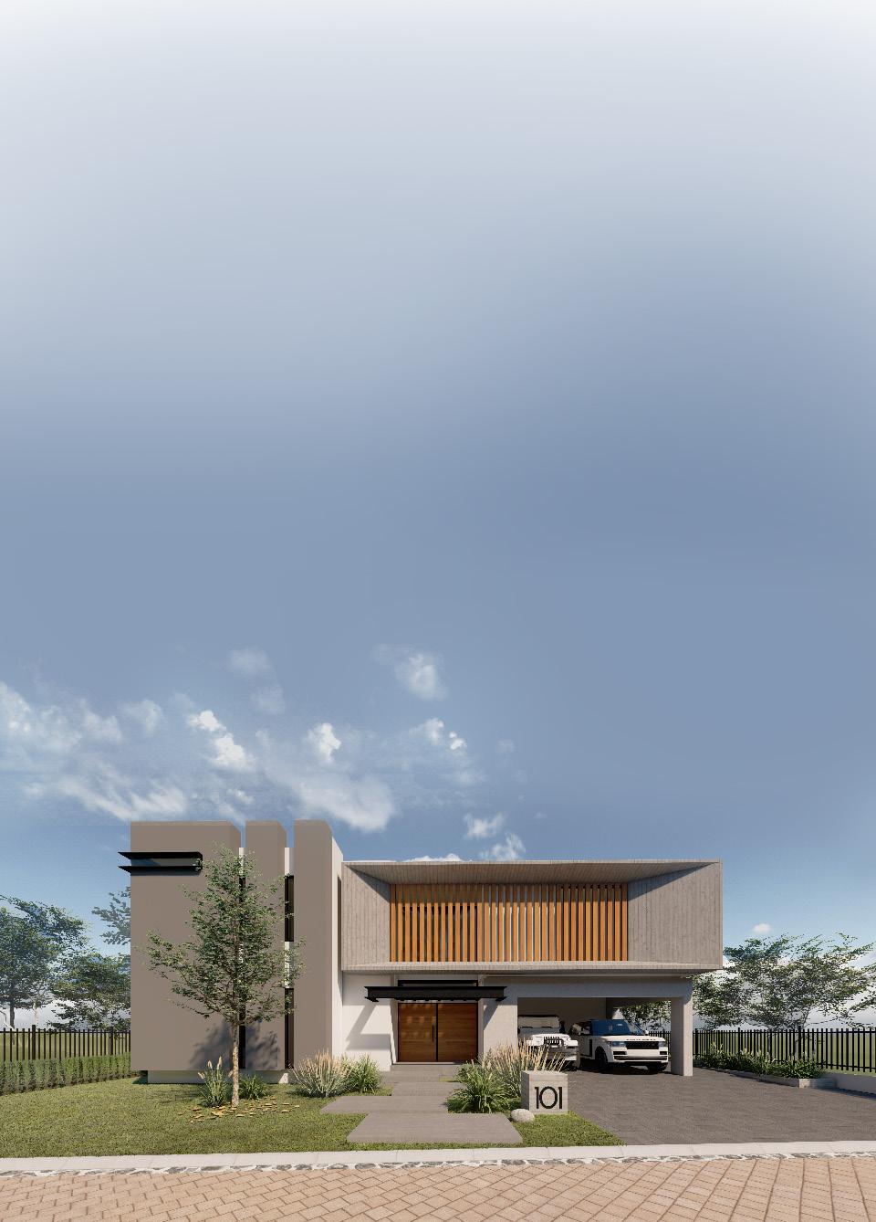 The house is situated on a plot of approximately 8,600 square feet. Within the social area, a double-height space features a veneered wooden floor, enhancing the sense of openness and connection to the outdoors.