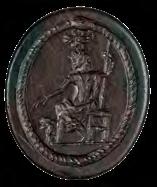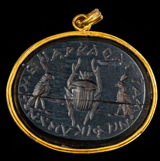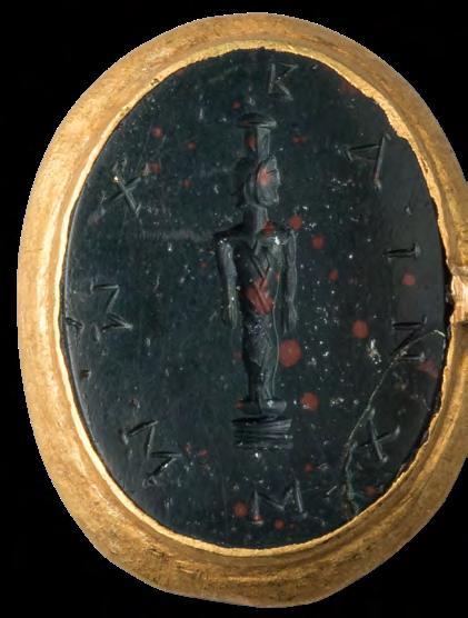 The Egyptian god Osiris, shown as a mummy, stands on a winged scarab beetle. Surrounding him is the ouroboros, a snake with its tail in its mouth, symbolizing protection. The back and sides of the gem are covered in magic names and permutations of vowels, which were thought to have special powers.