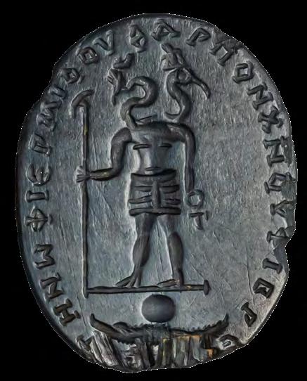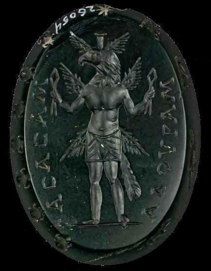This strange creature with the body and arms of a soldier, the head of a rooster, and snakes for legs appears frequently on magical gems, but his identity remains uncertain. He carries a whip and a shield, suggesting a protective role, and inscriptions often equate him with the sun god or the Jewish god Yahweh.