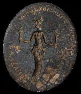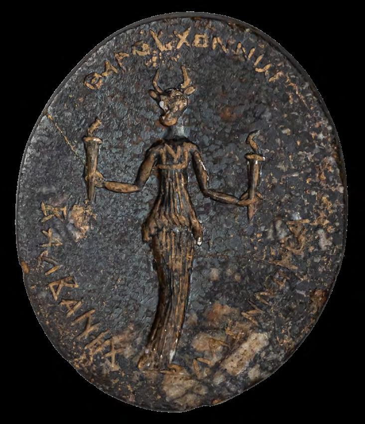 The reverse side displays the triple-bodied goddess of magic, Hekate, along with the names of the Jewish god Yahweh and the magical figure Abrasax.