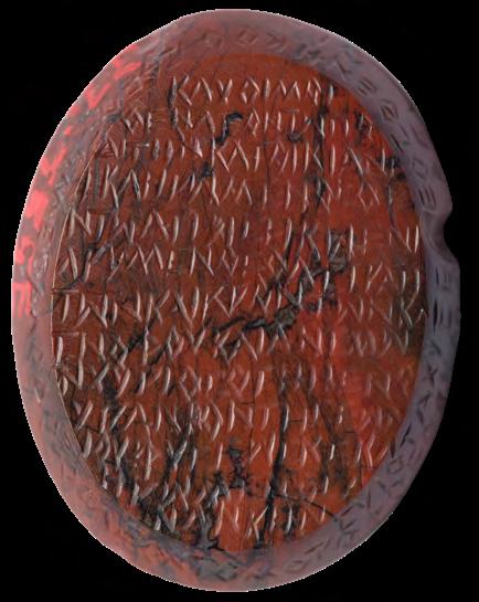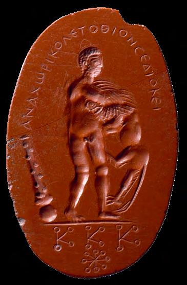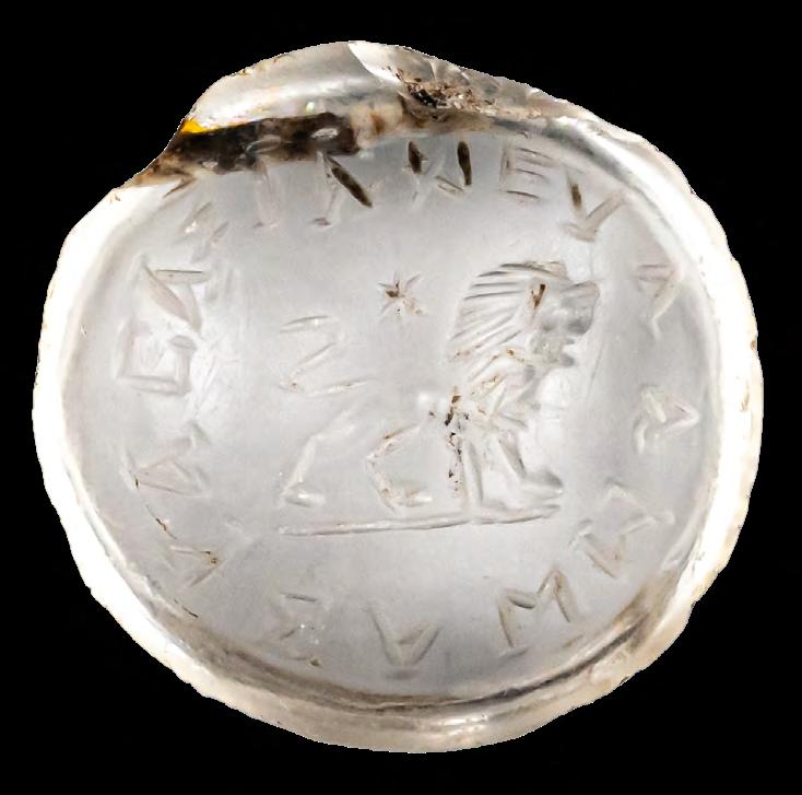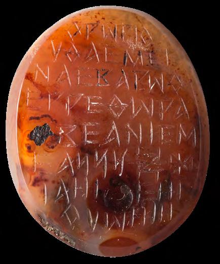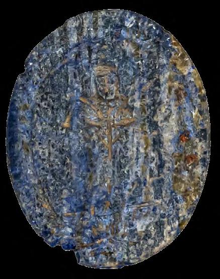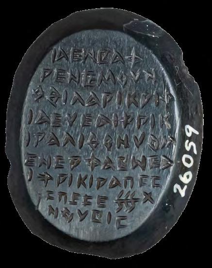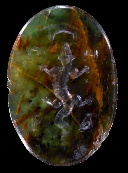 Gems of this type were used to treat eye diseases. It displays a lizard and a crescent moon, along with a Greek inscription that probably means “blind” and “heal the eye.” Lizards were believed to have the ability to regenerate their eyes, and the waning moon indicates the proper time of month for performing the healing ritual.