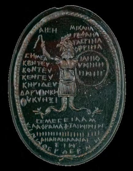 On this gem, the long inscription includes the names of the archangels Michael, Raphael, Gabriel, and Ouriel. The reverse side shows an eagle-headed Egyptian god whose identity is also unknown.